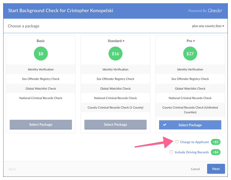 When you initiate a background check, you'll see a new option labeled "Charge to Applicant." When that has been selected, the applicant will be asked to give a credit or debit card to charge the background check to as part of the authorization process.