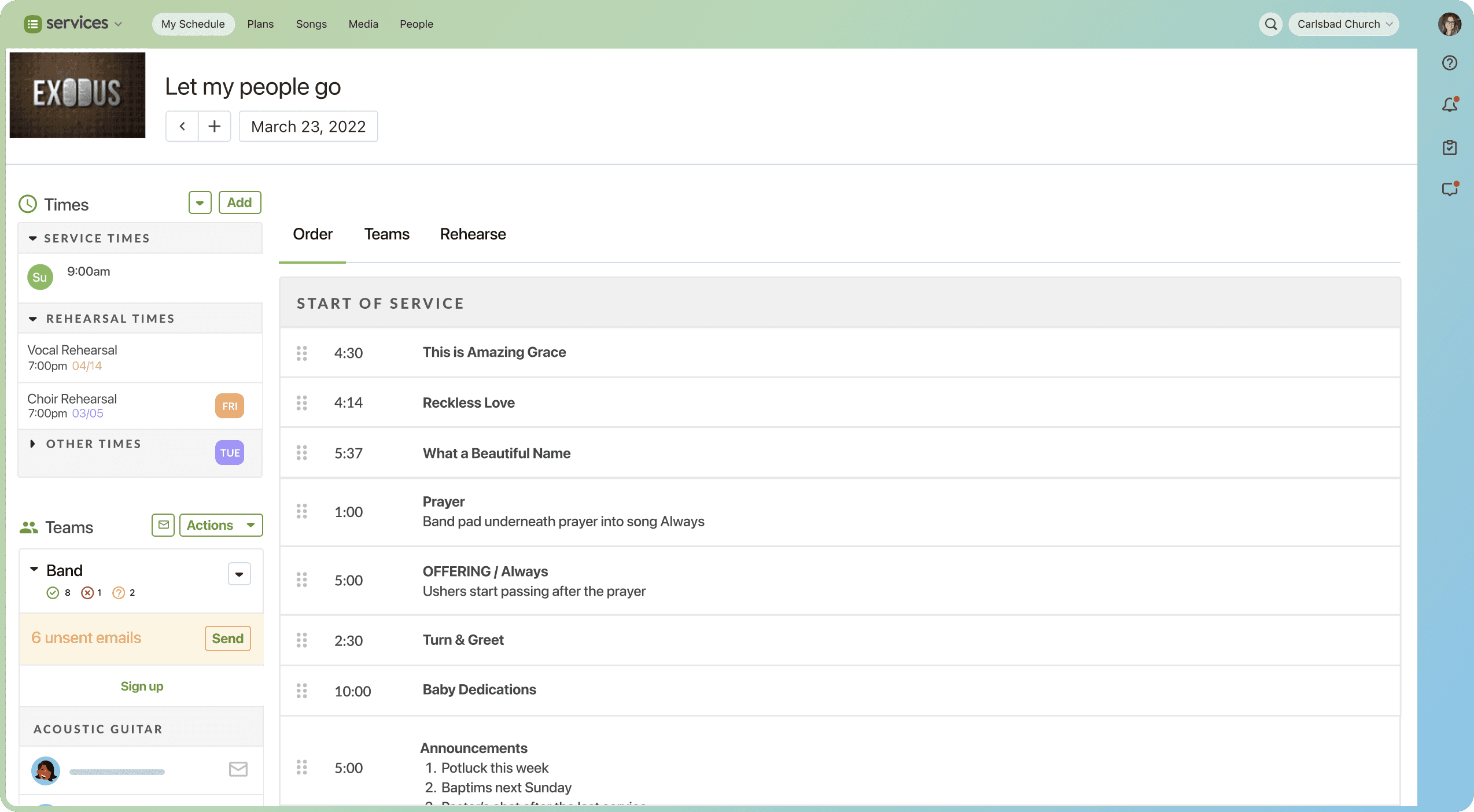 Worship planning, volunteer scheduling, team communication, and rehearsal tools all in one place.
