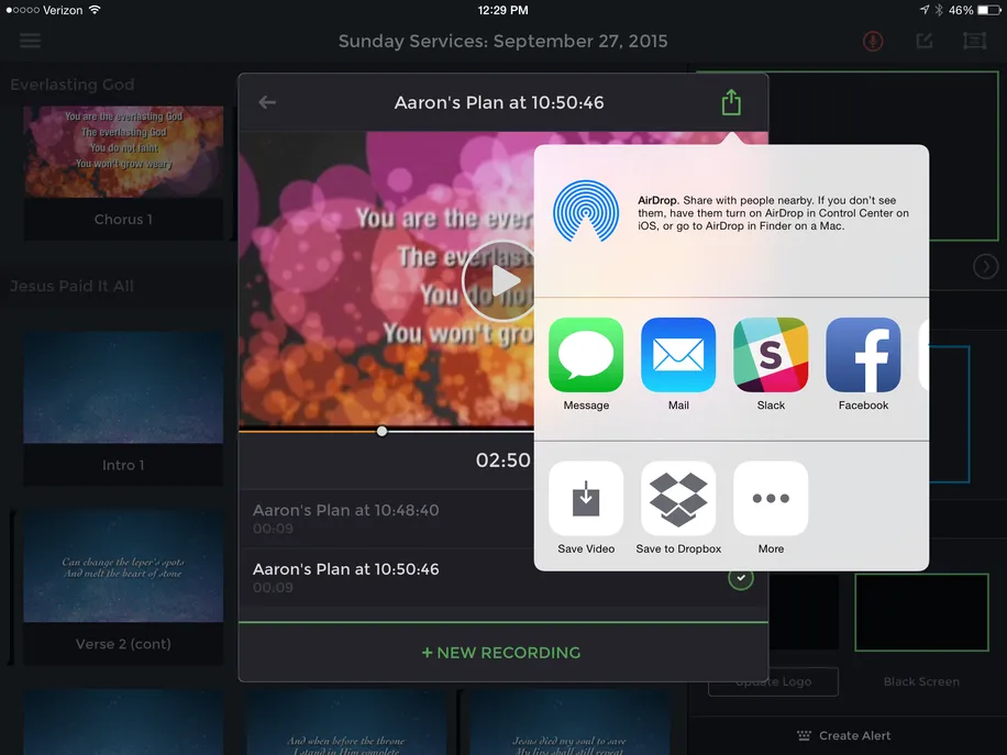 Projector, our presentation app for iPad & iPhone, was recently updated to verion 2.2 with a great new feature that lets you record your presentations along with live audio, and export it as a video file. You can easily start a recording at any point during your presentation, meaning you can record the entire service, or just start the recording at the message to create a sermon podcast.