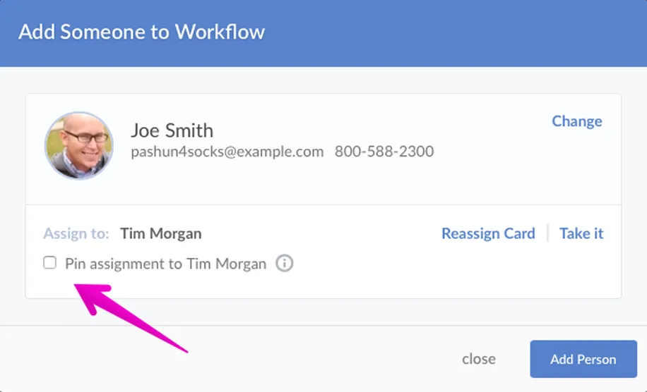 Second, if you find yourself constantly reassigning cards as they move through your workflow, or you have a bunch of workflows with the same steps but different assignees, you'll love pinned assignments.