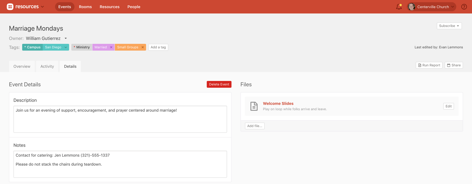 This Event page is both a finish line and a starting point for Resources. It built on the work we started with the calendar and tags, and sets the product up for new features and updates to even better support you in managing your church calendar.