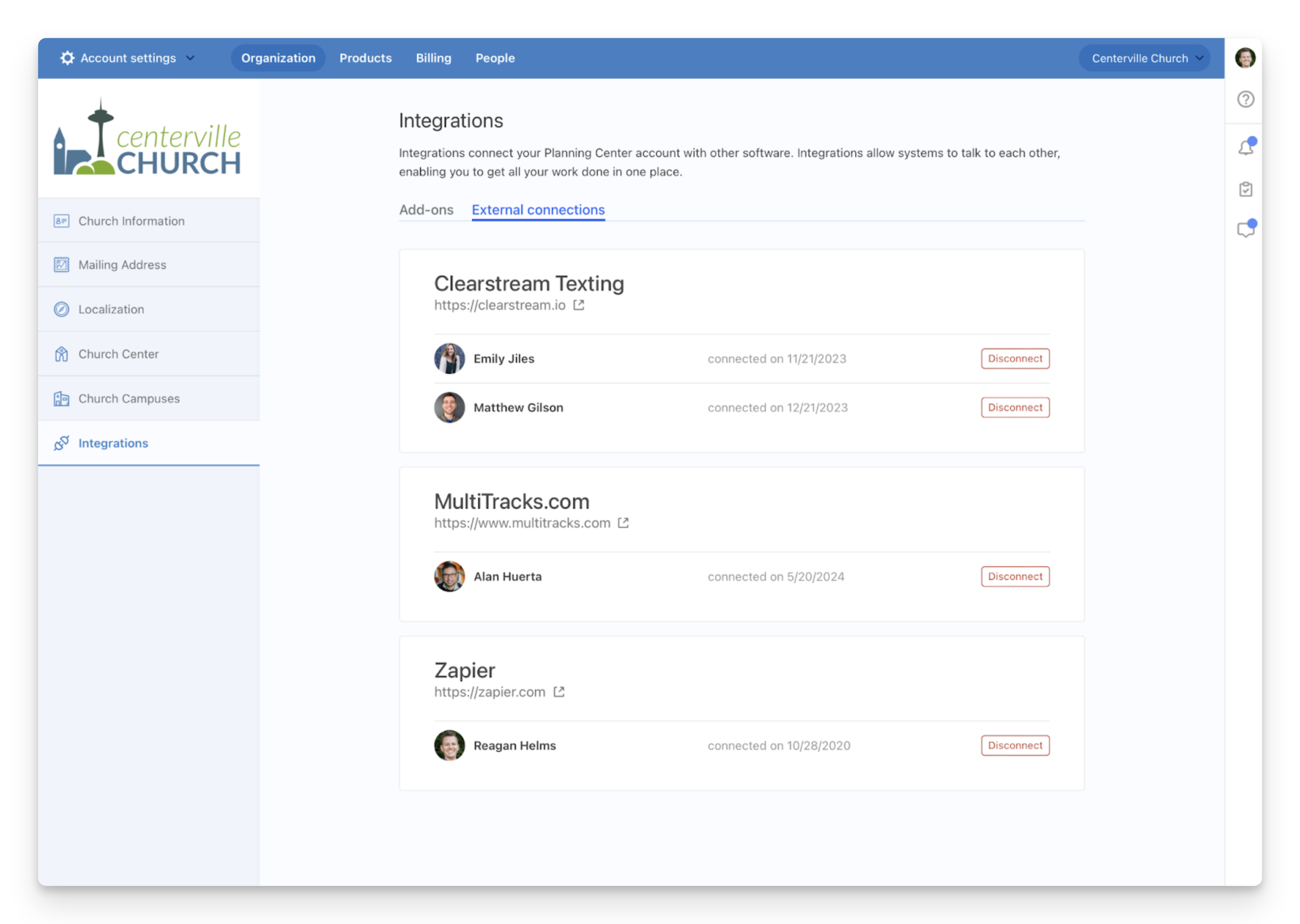 Sometimes an Organization Administrator might not want their church’s data to be shared with a certain third party, or to at least know all of the third parties with which their data is being shared. That’s where the new Integrations page comes in.
