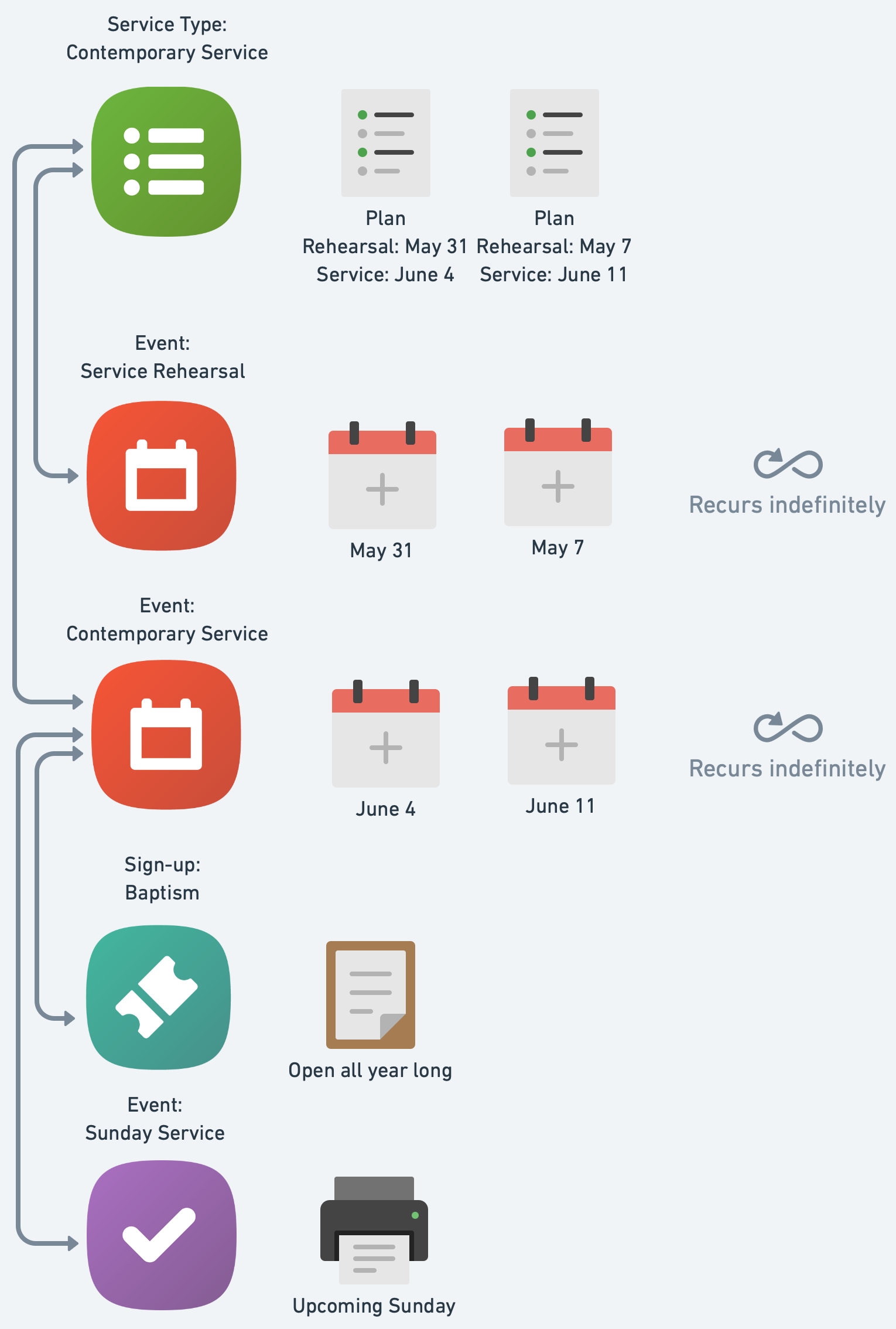 When it comes to Services, Calendar connects to the Service Type (as opposed to individual plans) which allows for all kinds of flexibility. You can connect many, many Calendar events to a single Service Type as needed, and then connect check-ins and sign-ups to those Calendar events as well.