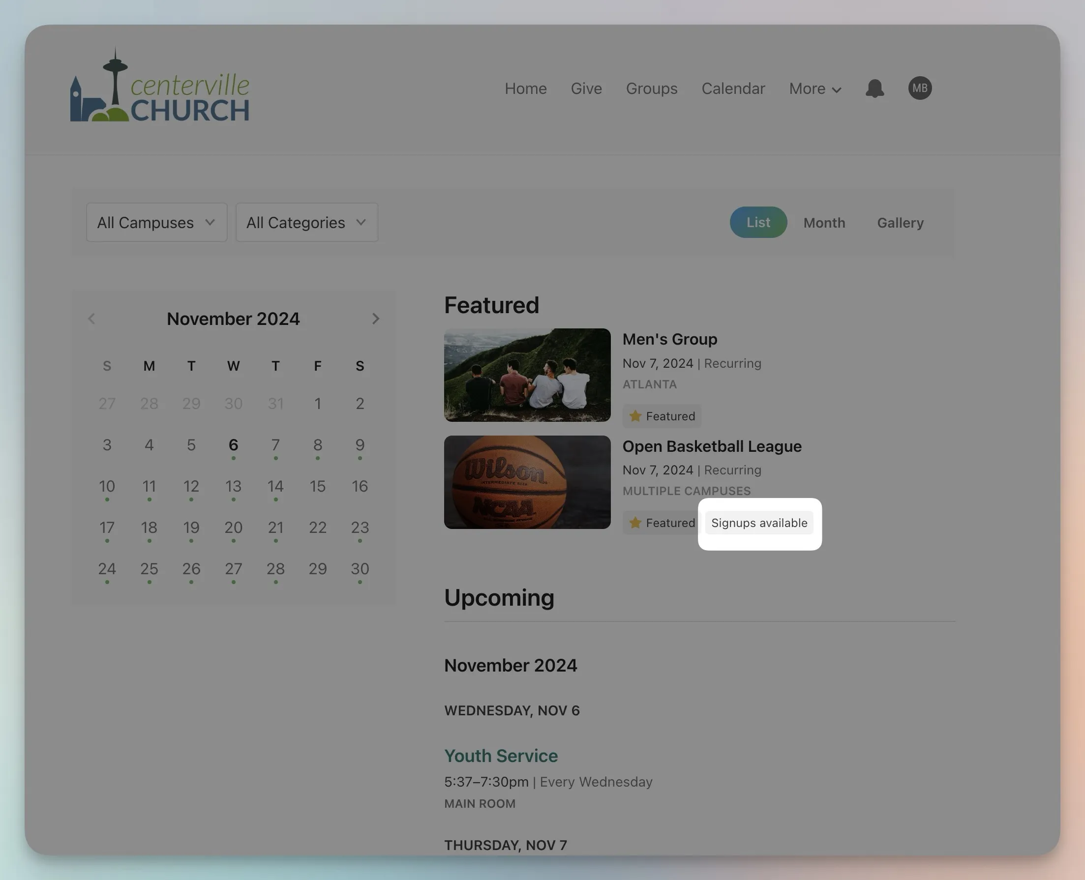 We just released a small but mighty update to your events on Church Center: a dynamic status badge for events that have signups available! Previously, any Calendar event that had a connected Registrations signup would show a “Signups available” badge, whether or not the signup was actually open or not. Now, that “Signups available” badge will only show for connected signups that are actively accepting new registrations!