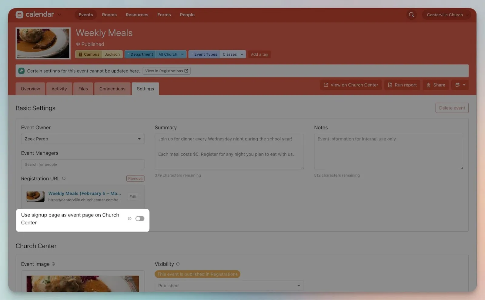 We want to make it easy for your congregation to engage with church life, which is why clear and simple access to event information and signups is so important. To support that, we’ve introduced a new setting that lets you choose which event page serves as the main landing page for your congregants. On your event’s settings page, you’ll see a new option when you have a connected Registrations signup: