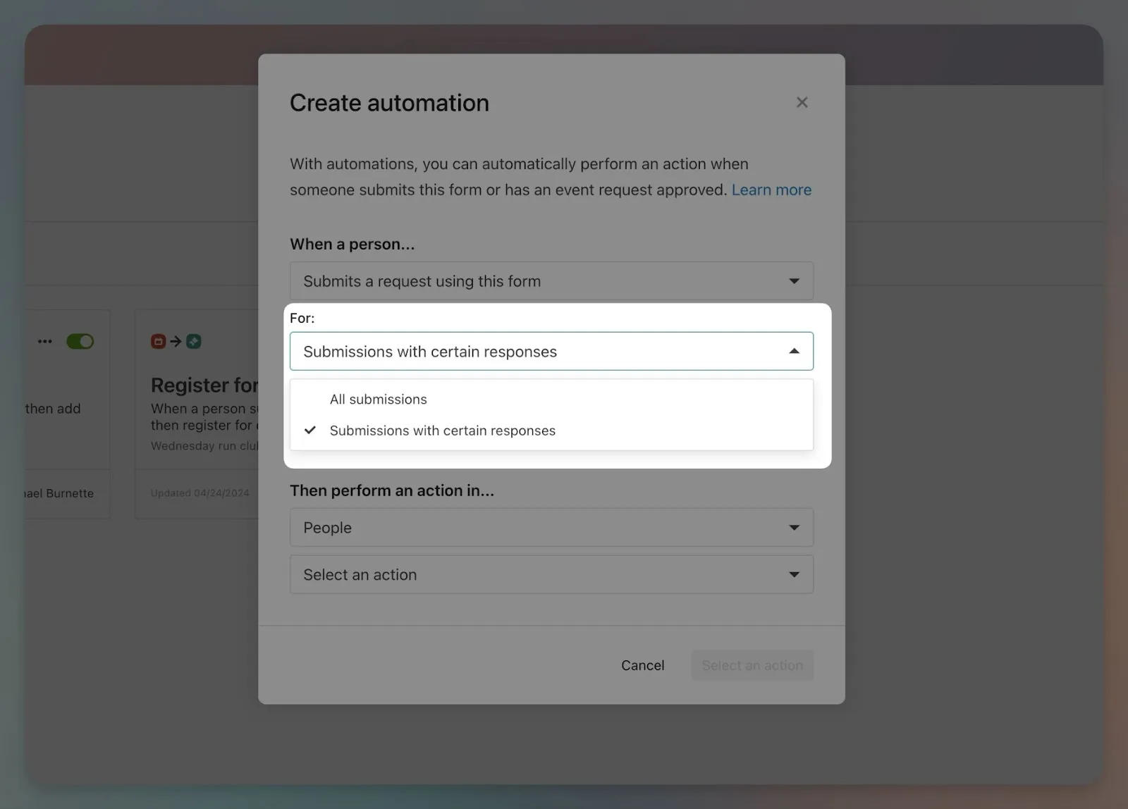 Automations for event request forms are a powerful way to perform actions in other products when an event is requested in Calendar. Now, we’ve made this feature even more powerful with the addition of dynamic triggers. To get started, head over to one of your Calendar forms and go to the automations tab. Then, create a new automation and you’ll see this new option: