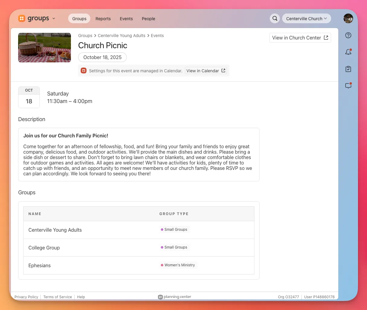 These Calendar connected and promoted events also display a view-only version for congregants in Church Center (web and iOS/Android app versions 2025.10.9 or newer).