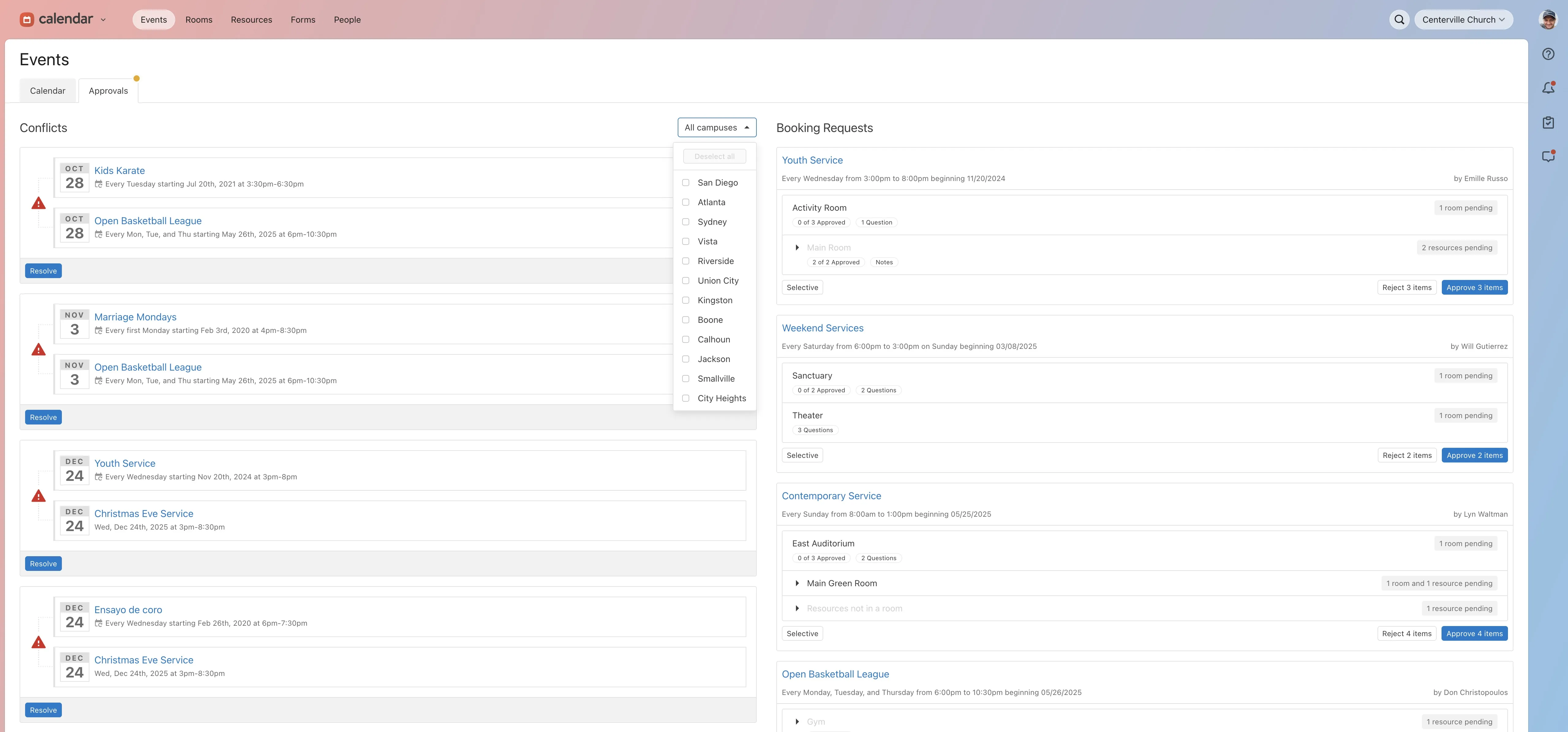 If your church has multiple campuses, managing room and resource conflicts just got a whole lot easier. We've added campus filters for conflicts, so conflict resolvers can now quickly narrow down conflicts to only the ones relevant to their campus.:quality(80))