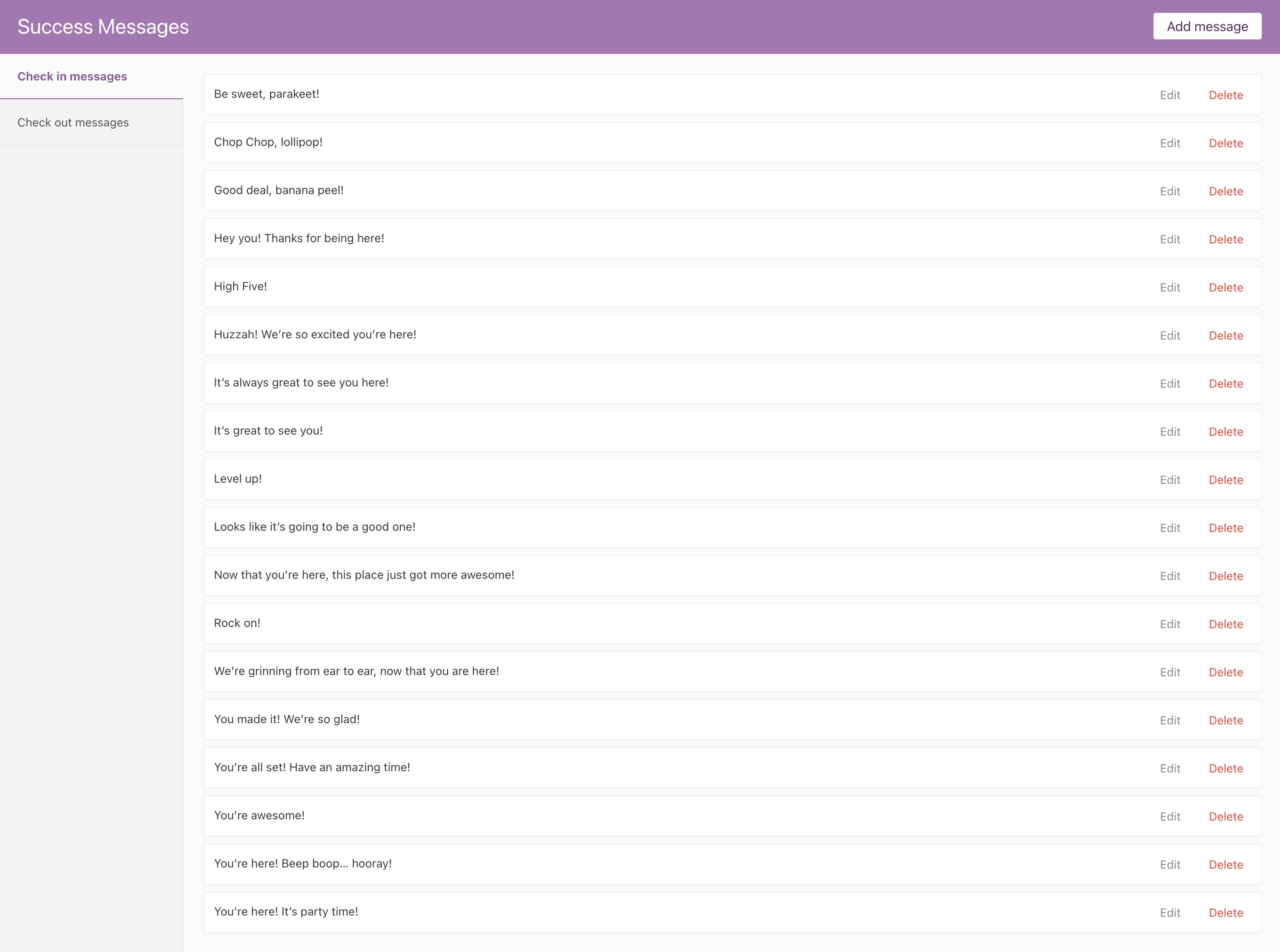After every check-in, there's a few seconds of a screen that shows fun success messages that may or may not fit the brand your church desires. Now you can customize both the check-in and check-out messages to whatever you want, within a short character limit 🙂