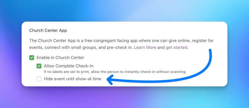 If you're a church that uses Church Center to check people in, without labels and without the pre-check QR code, we've now added an option for the event to honor the show-at time.