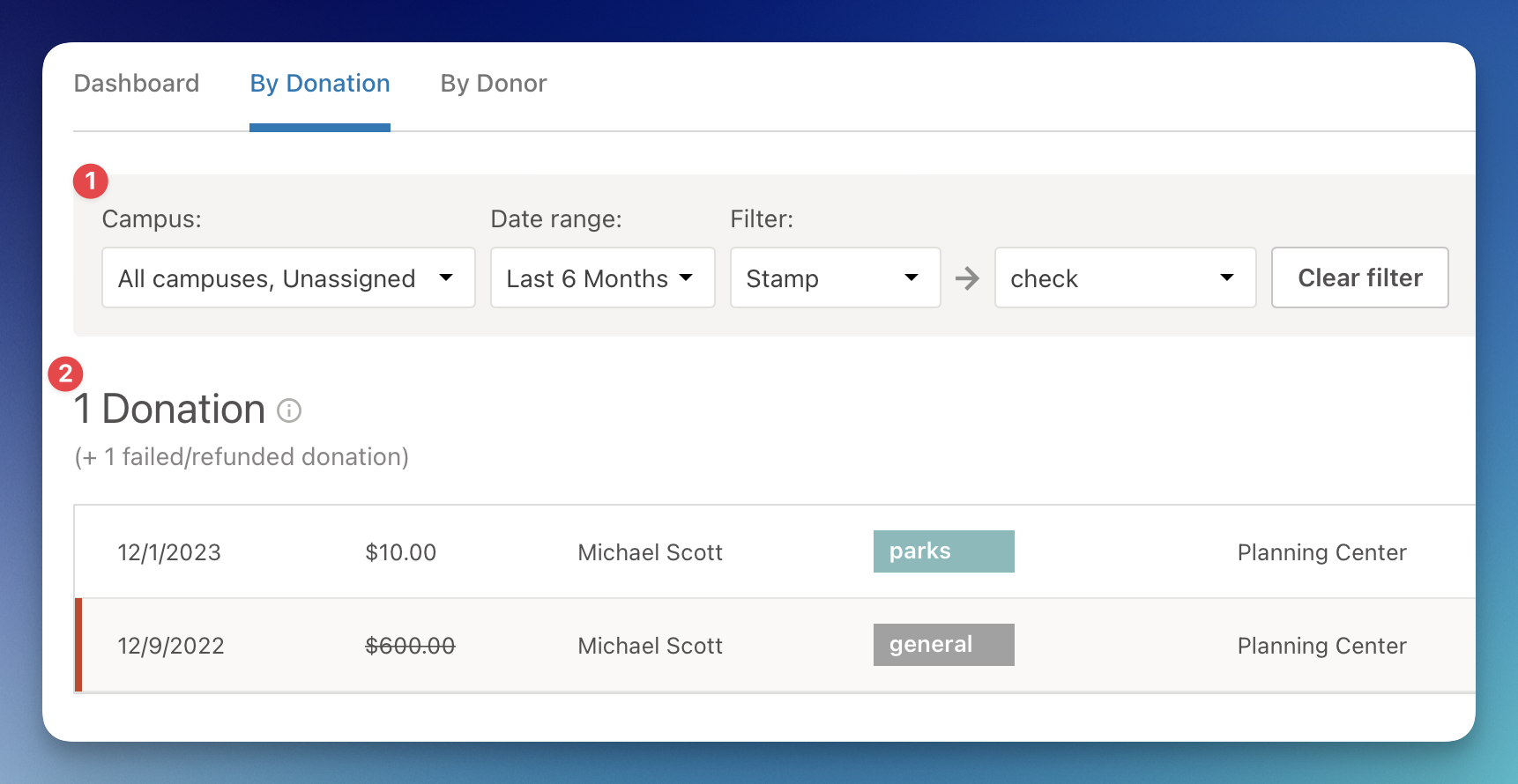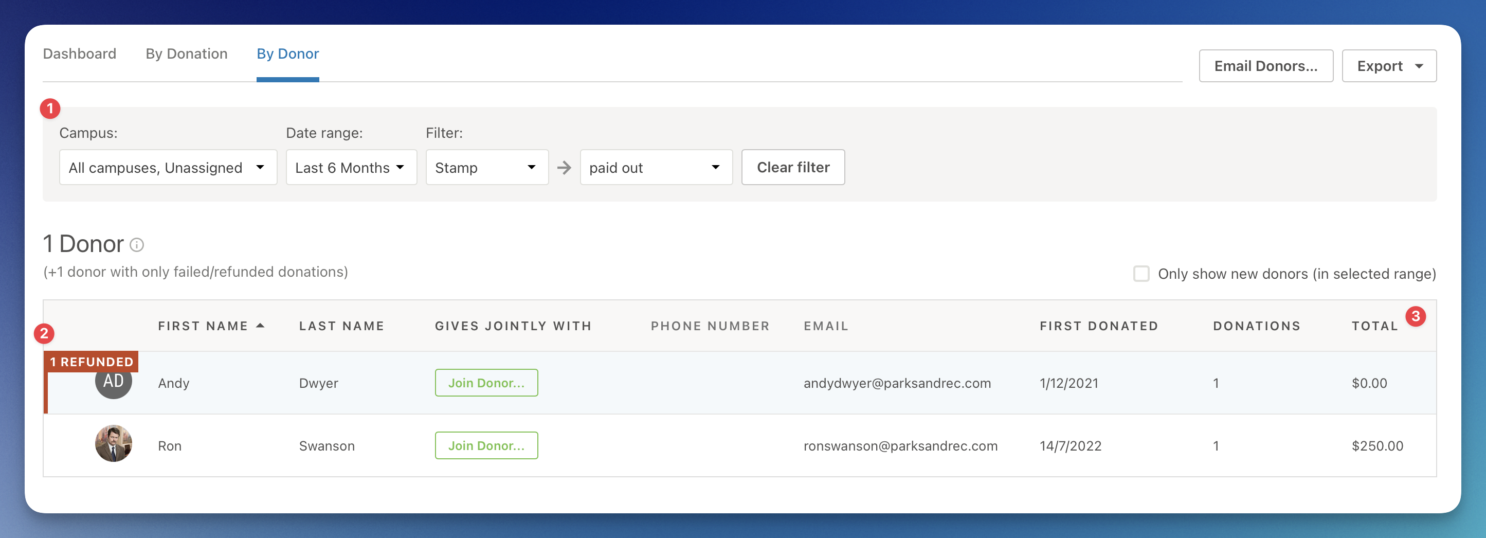 Now, it's easier to see when a donor has had a refunded or failed donation within the date range you are viewing.