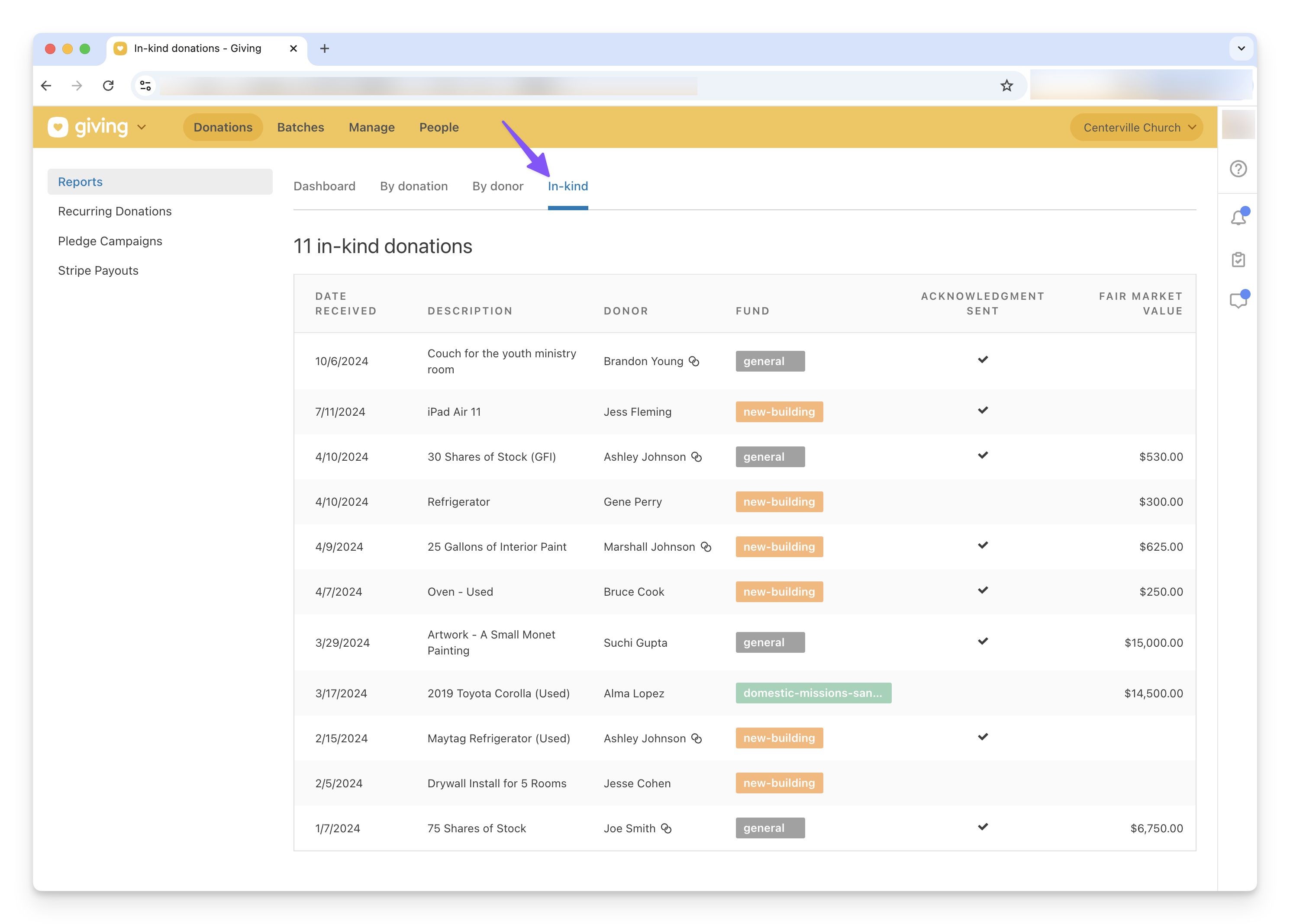 📍Note: In-kind donations have not been integrated into other reports within Giving at this time (Dashboard, By Donation, and By Donor). Due to the differences between in-kind and monetary donations, we've decided to manage them separately. Additionally, the functionality to export in-kind donations or access them via our API has not been implemented yet. Our initial launch has been strategically focused on addressing the primary needs highlighted by our churches: entering in-kind donations and facilitating the delivery of receipts and statements to donors.