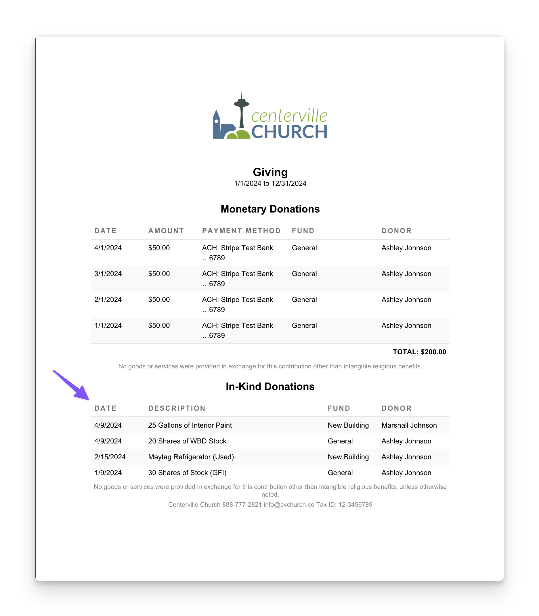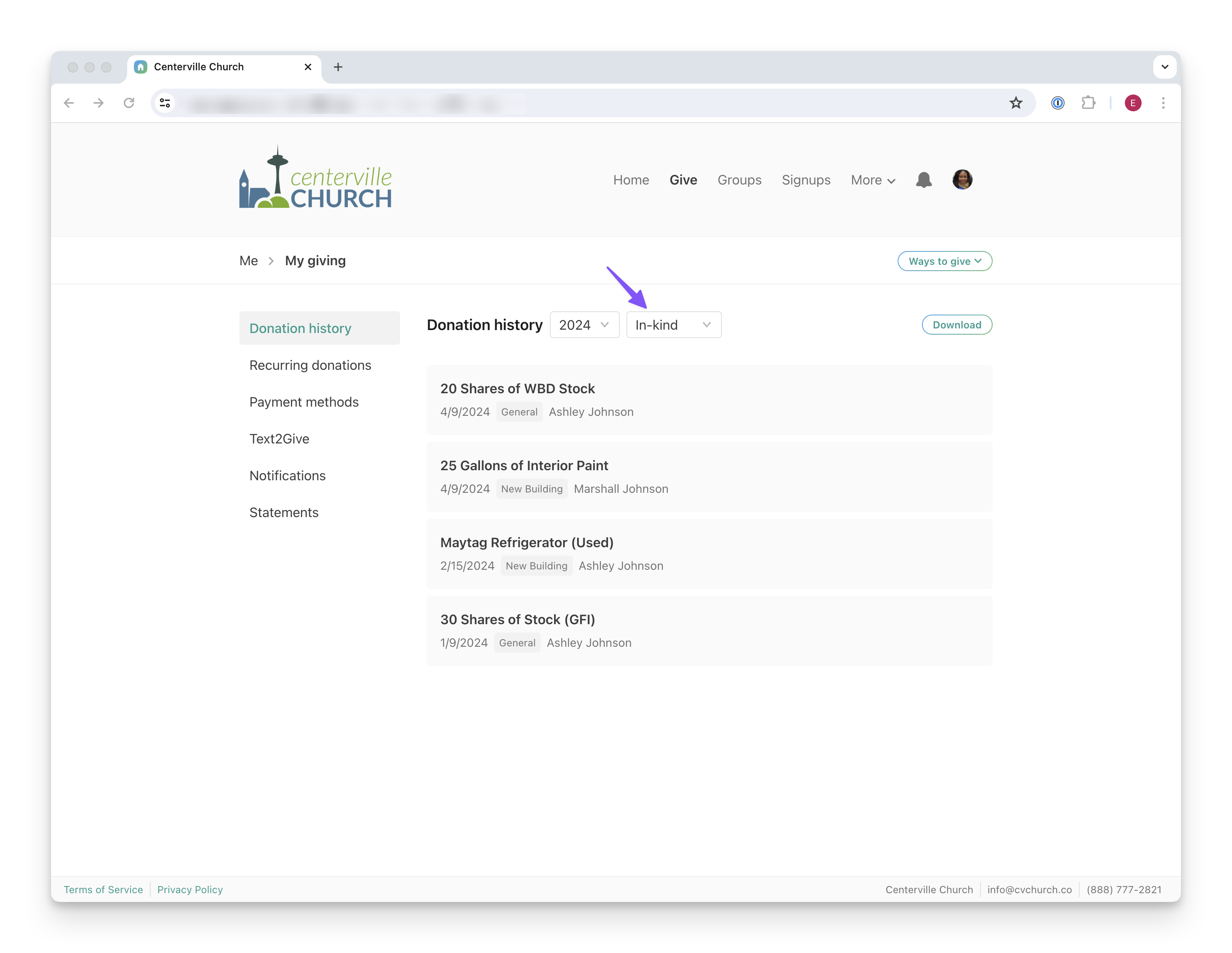 Your donors will now have a more comprehensive overview of their donation history. Beyond the optional acknowledgment letters you can send, donors will have the ability to view their in-kind donations directly in Church Center, accessible both on the web and via the mobile app: