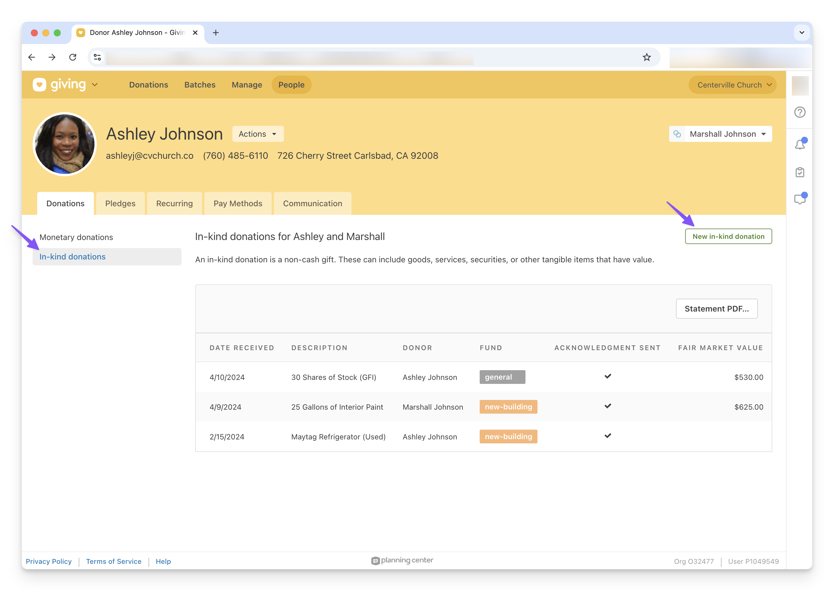 📍Note: If a donor has not made any in-kind donations, their experience in Church Center and on their annual statements will remain unchanged. The information visible to these donors will not be altered. Additionally, the fair market value of an in-kind donation will only be visible in Church Center and on statements for countries where churches are permitted to determine the valuation.