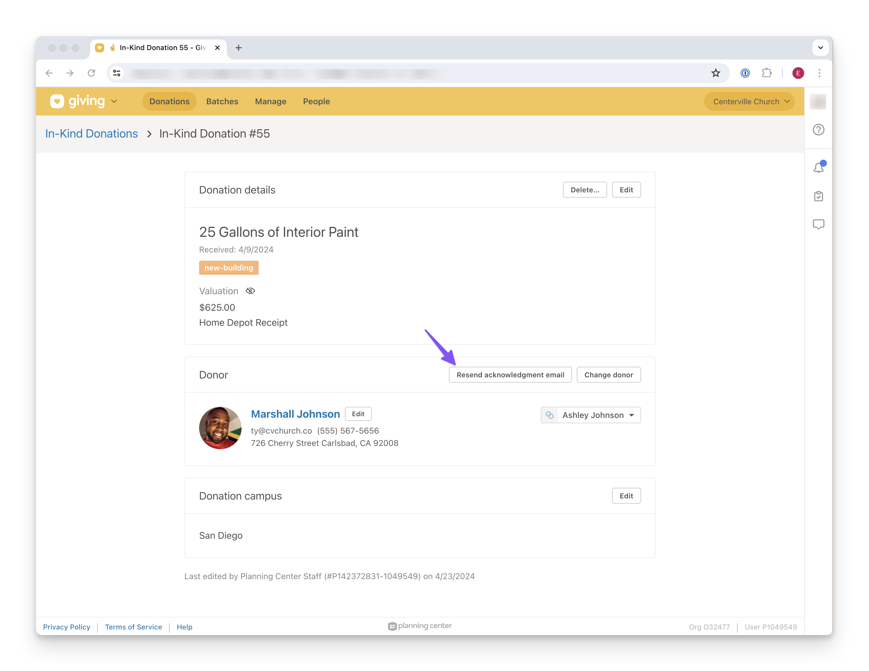In the final step of entering an in-kind donation, you can send an acknowledgment letter to your donor with a single click! This letter can serve as a thank you note and a receipt for tax purposes. For those interested, there's the flexibility to customize this letter before it's emailed. If you choose not to send it right away, you have the option to send (or resend) the acknowledgment from the donation page at a more suitable time.