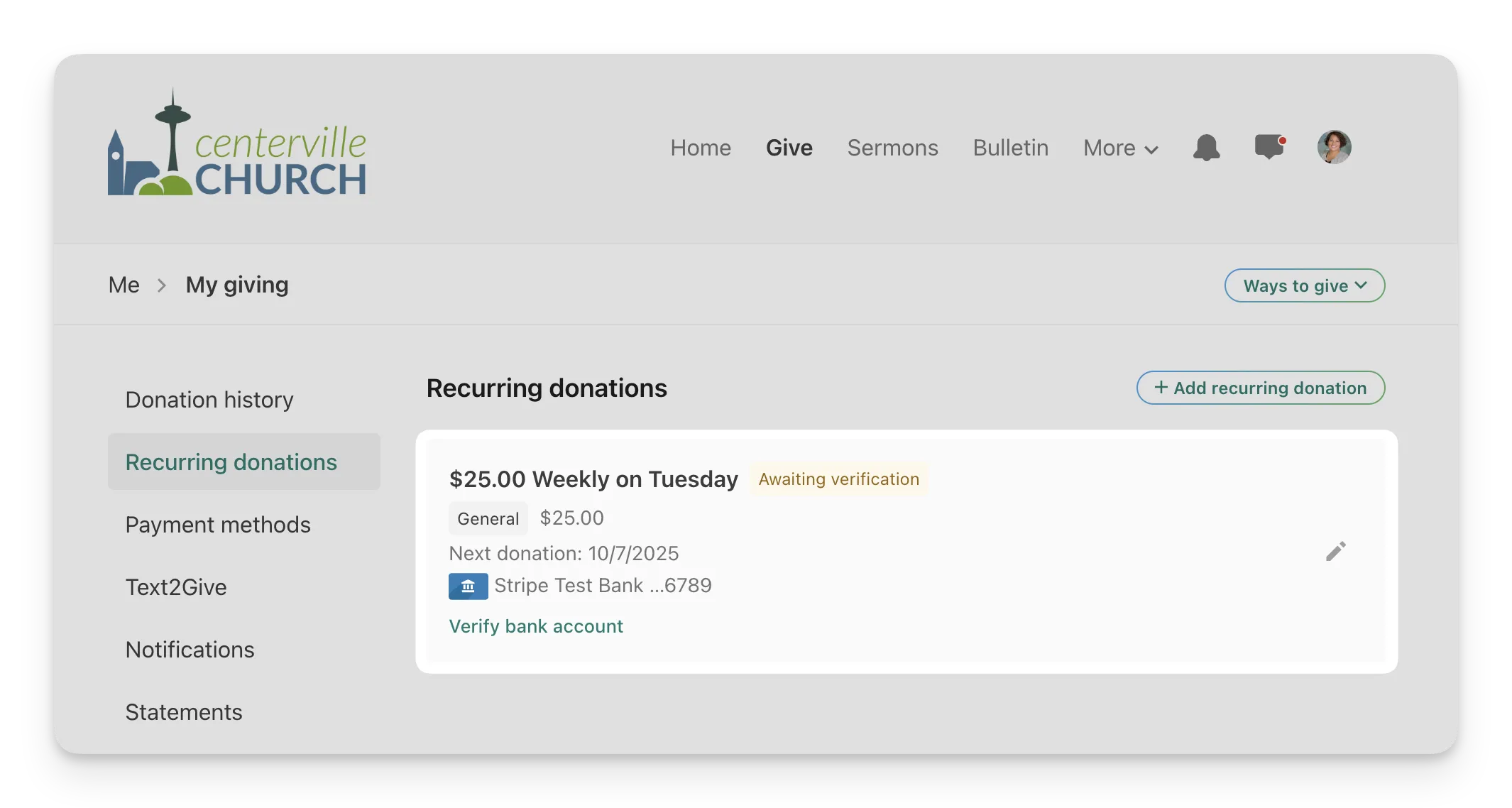 For recurring donations, if the first scheduled occurrence falls within the 10-day window but before verification is complete, it will fail and the notice will be sent. The next scheduled occurrence will succeed if the account is verified in time. If not, the recurring donation remains in Church Center, but will show a warning that the payment method is missing.