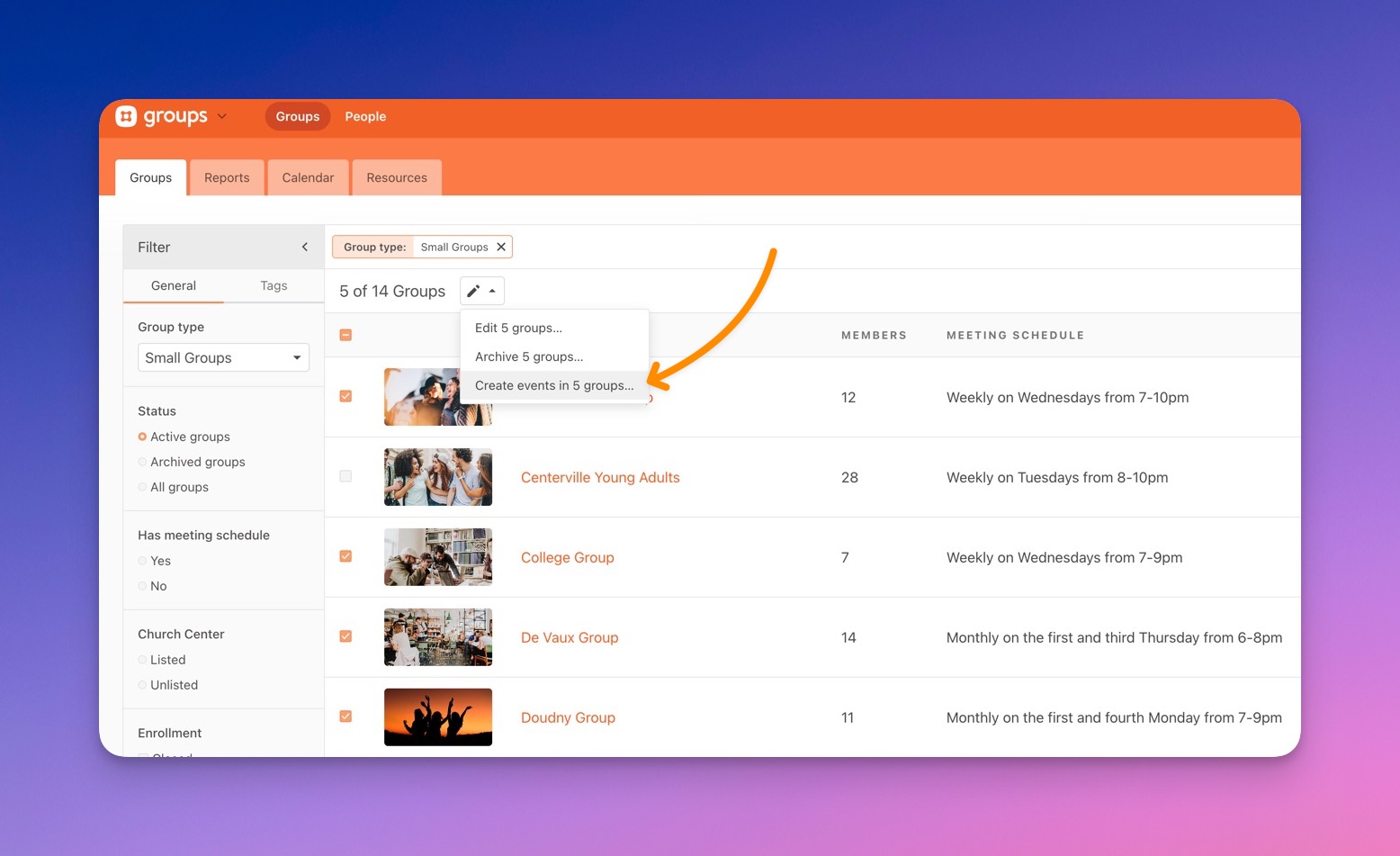Note: This feature requires that your groups have a meeting schedule set. We will skip creating an event for any group that does not have a meeting schedule. To help with this, you can filter your groups to ones that don't yet have a meeting schedule, and add it directly from there.