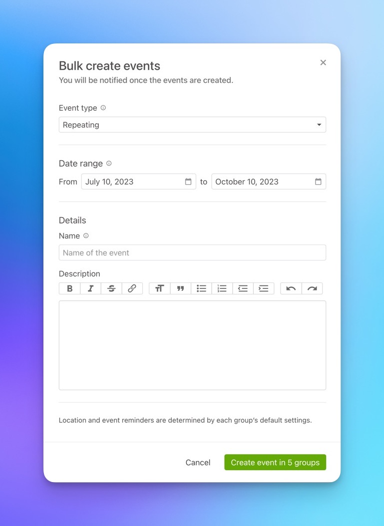 When you are setting up and organizing your groups you may want to create events for more than one group at the same time. Well now you can create new events in bulk, in two different ways!