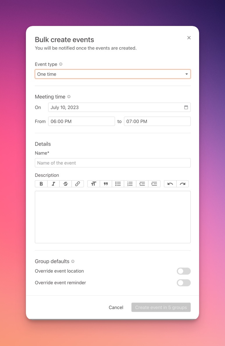 Do you have a small groups kickoff meeting, a BBQ, or maybe a prayer event that you want to add to more than one group? Now you can do that in bulk! When you create a one time event, it’ll create separate events in each of the selected groups, all with the same shared settings you chose on the creation page.