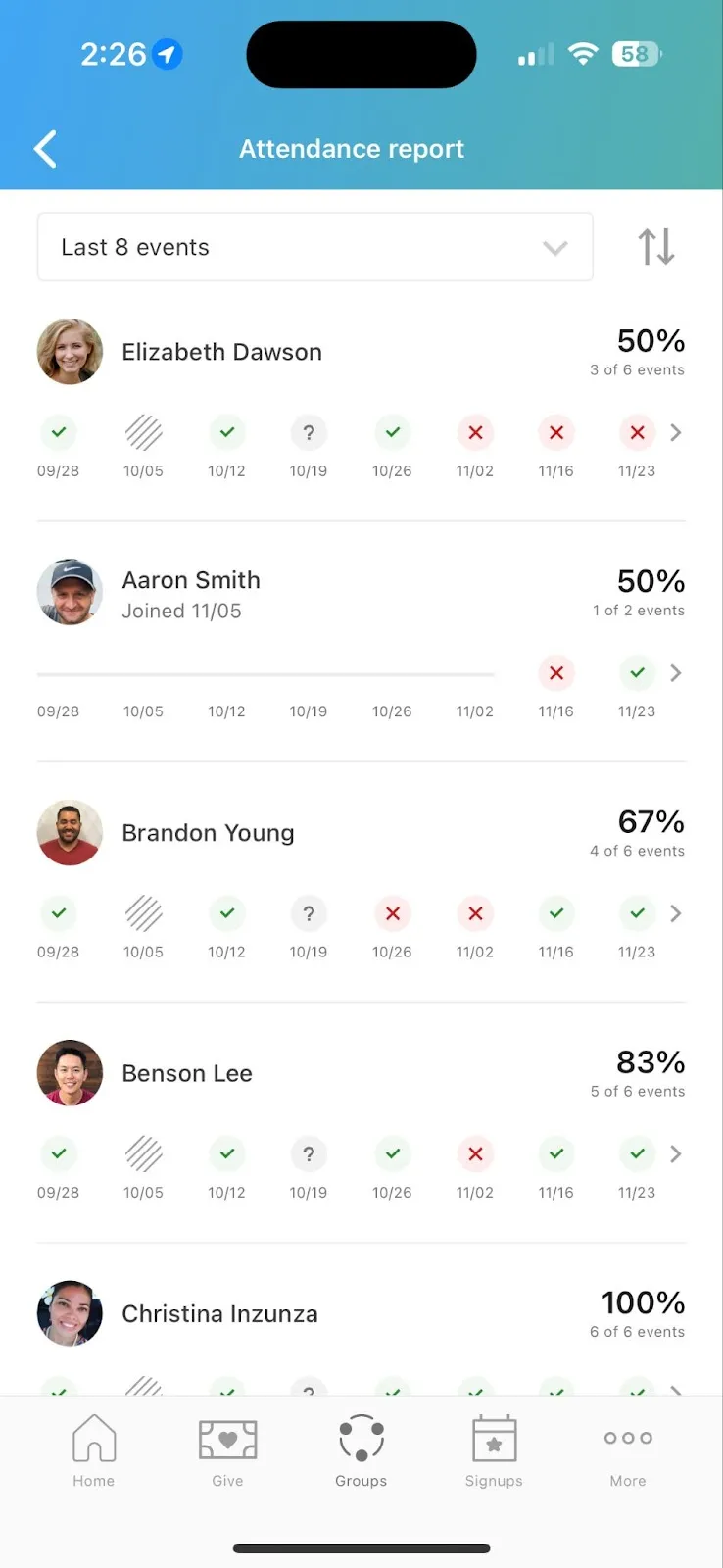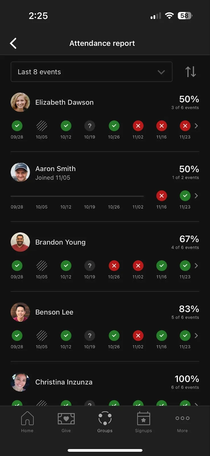 From the Events tab in Church Center, leaders will see an attendance alert at the top of the page that takes them to this new attendance report! This report will give you an overview of everyone's attendance, sorted by their attendance percentage, enabling you to quickly reach out to those members who haven’t been attending regularly.