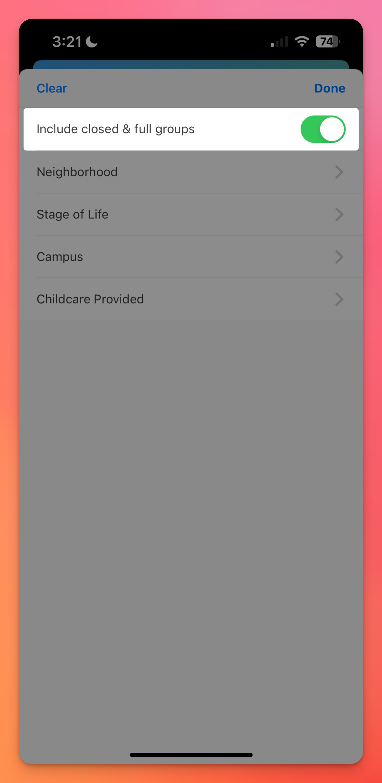 By enabling this setting, Church Center will default to show all listed groups in that group type. Congregants can still use the Church Center filters to hide closed & full groups from their view.