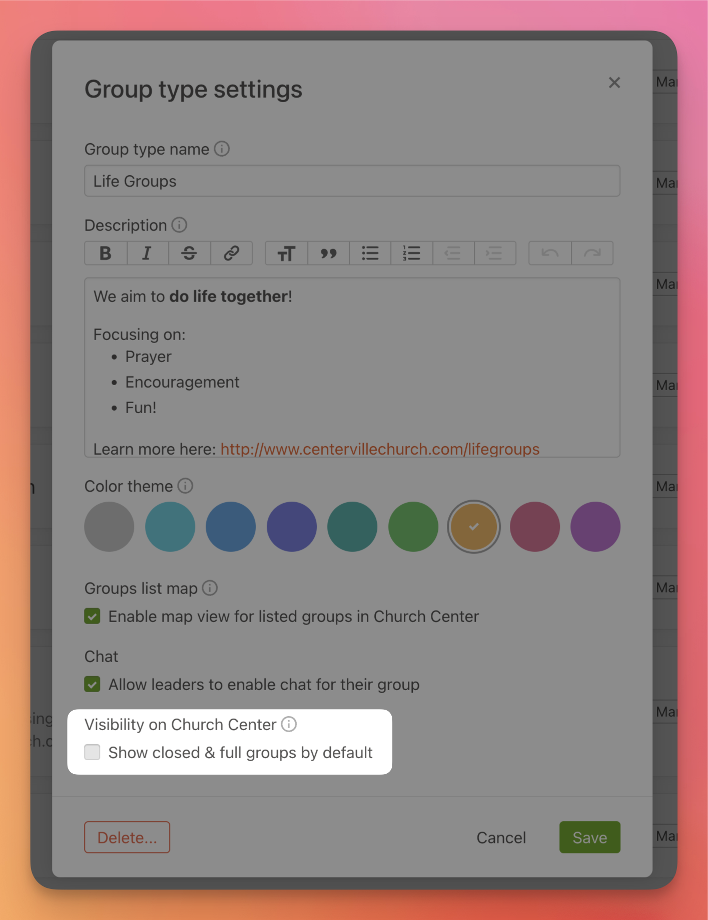We listened to your feedback and added a new group type setting that lets you default Church Center to show all listed groups, even if they are closed or full. This gives you the ability for example to promote/preview upcoming groups that aren’t ready to let folks join yet.