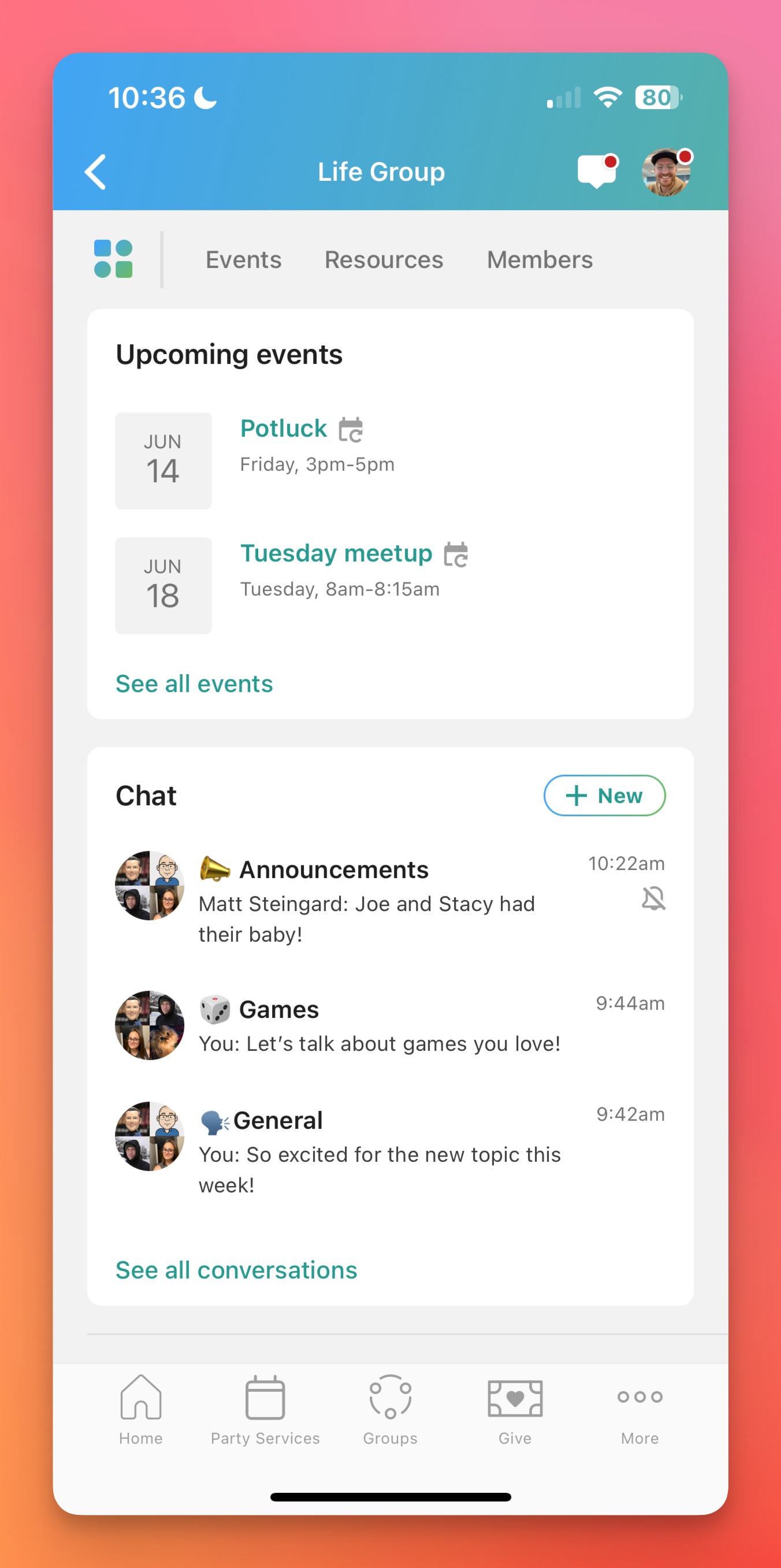 The dashboard gives your Group a one-stop shop to see what’s going on at a glance and make doing life together a breeze. We envision adding additional widgets and features to the dashboard in the future that can enhance group engagement and community even more.