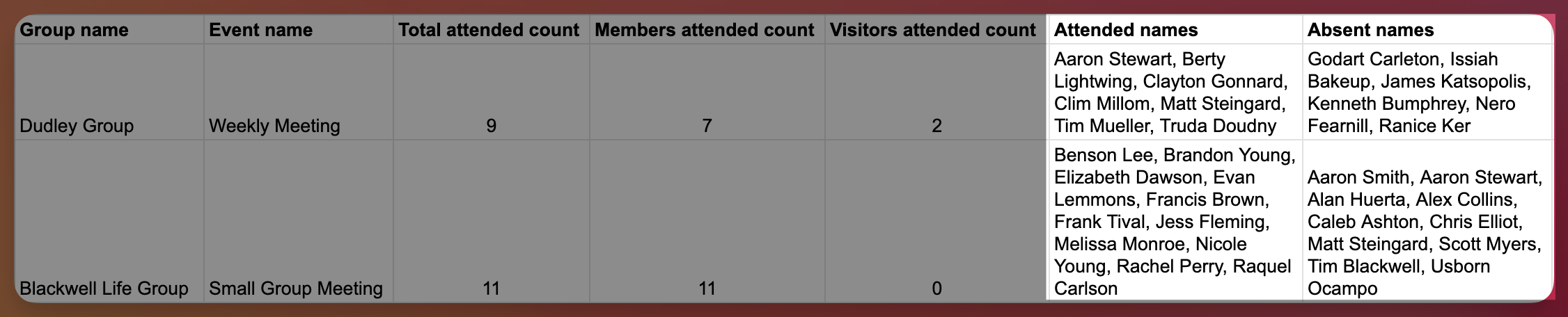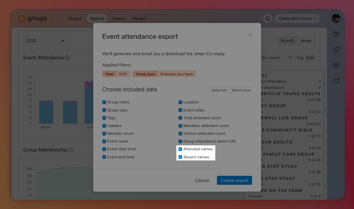 We’ve added columns for attended and absent names to the multi-group attendance CSV export to give you a clearer picture of who was present—and who wasn’t—at each event.