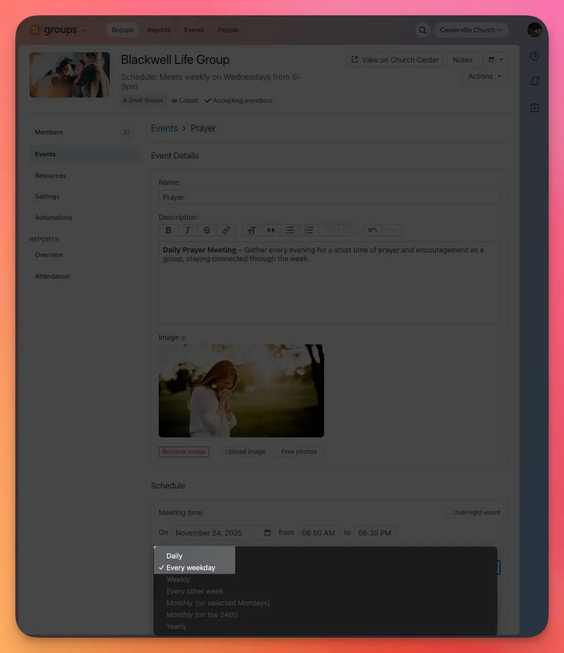 You can now set group events to repeat daily. Perfect for events like a daily Bible reading plan, a week of daily prayer meetings, etc.
