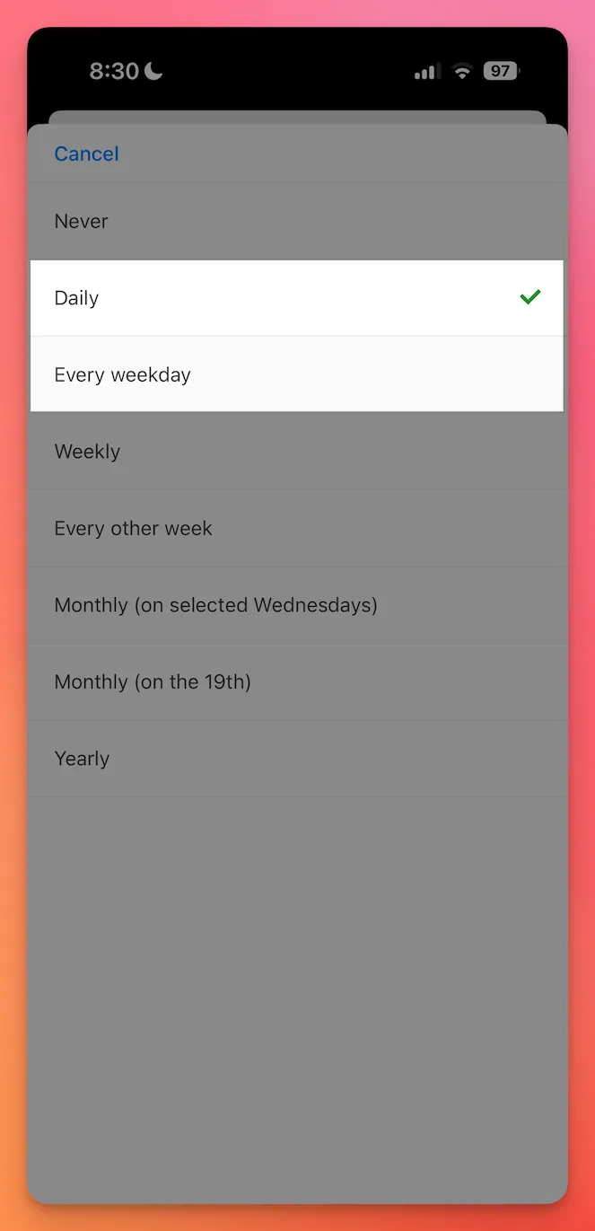 When you create or edit events on the Groups admin side or in Church Center (web, or iOS/Android version 2025.11.12 or newer) as a leader, you'll now see two new options in the Repeat menu.