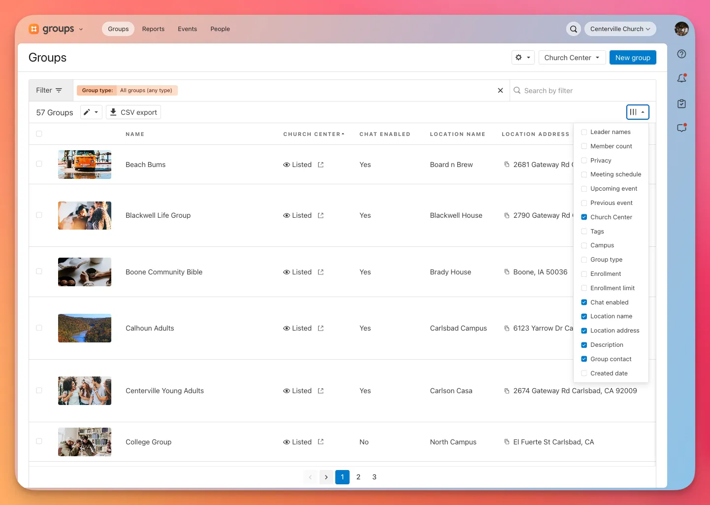 These new columns include: Chat enabled, location name, location address (with a button to easily copy the address), description, and group contact. Also, we added a link next to the listed groups to easily see them on Church Center.