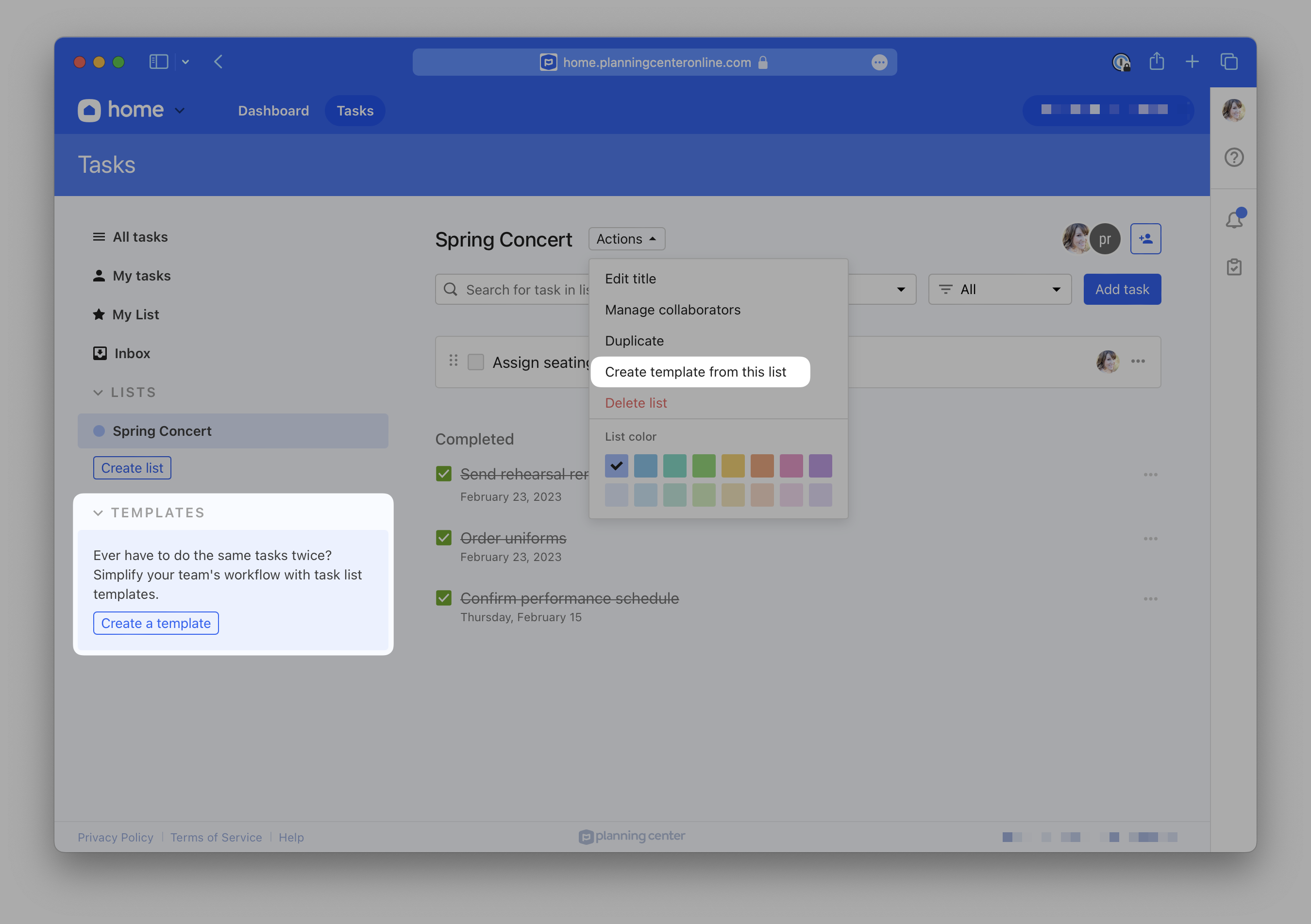 When it’s time to start on your project or event, create a new task list from your template in one click.