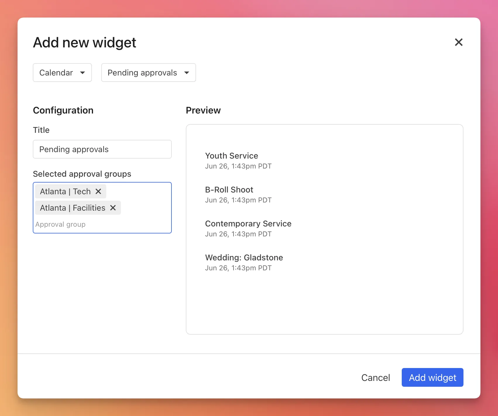 Previously, the "Pending Approvals" widget was only accessible on your private "My Dashboard" but we've made some upgrades so it's also useful on shared dashboards. To get started all you've got to do is hop into a dashboard, select Calendar's pending approvals widget, and choose the approval groups you'd like monitor.