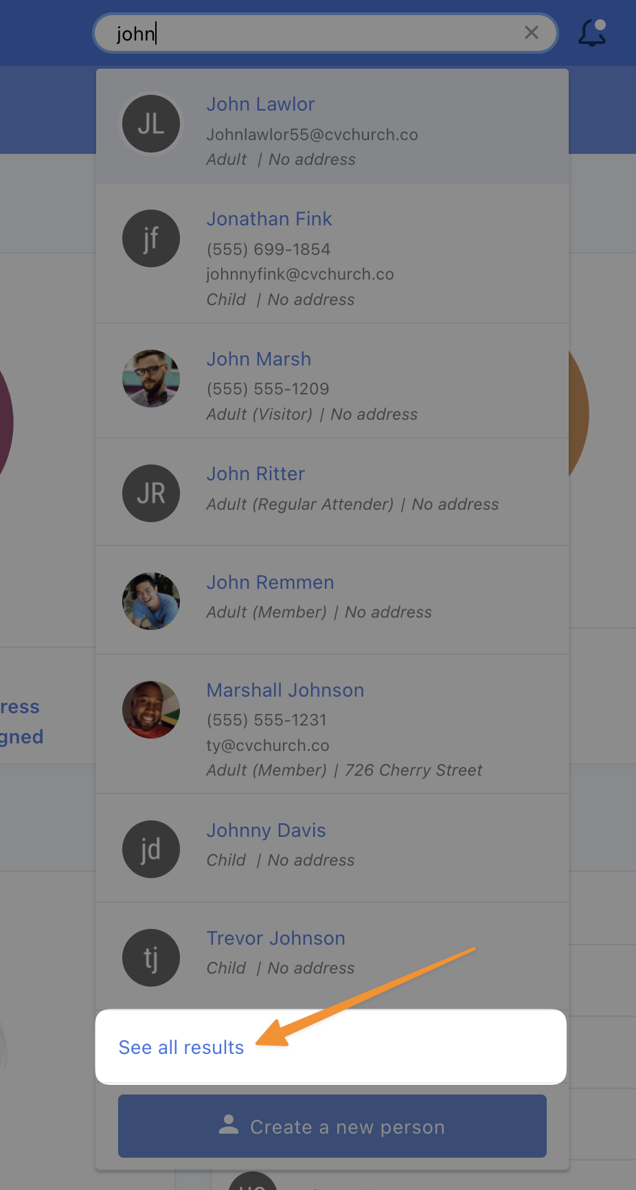 Do you know about our beloved 🔍? It's in the top right corner (near the beloved ? that lets you quickly access documentation and support) and it lets you search your people database by name, email, phone, or mailing address! (Pro tip: you can open it up from nearly every People page with the / key.)