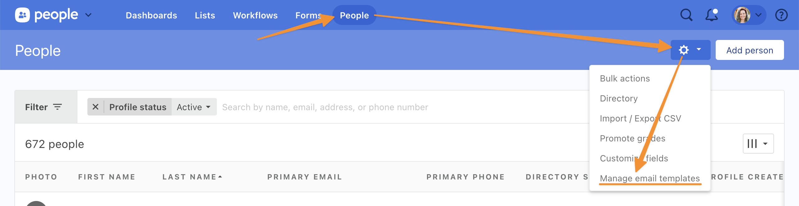From the people tab, click the settings icon, and voilà! Manage email templates!