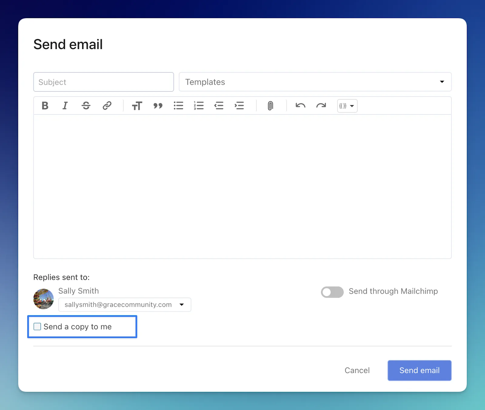 We’ve added the option to send a copy of a list email to yourself, which will be delivered to your primary email address. You’ll find the option at the bottom of the “Send email” modal. This setting won’t be available if “Send through Mailchimp” is enabled.