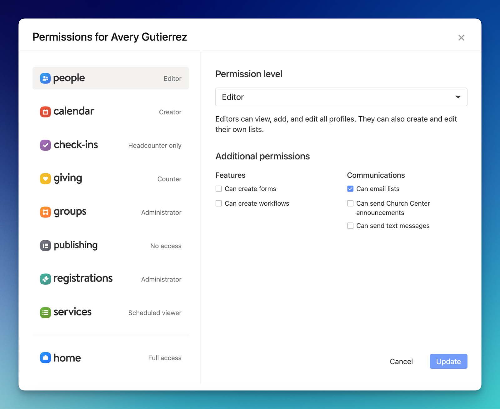We just released an update to our permission editor, which we think you’ll love! When you edit someone’s permissions in Planning Center People, you’ll be presented with a new modal. For now, most of the functionality is the same, only allowing you to edit People permissions here. We’ve also separated all the products into their own tabs to provide more detailed information about each product and role. Over time, this feature will evolve to include more functionality across all products, giving you better visibility into who has access to which features.
