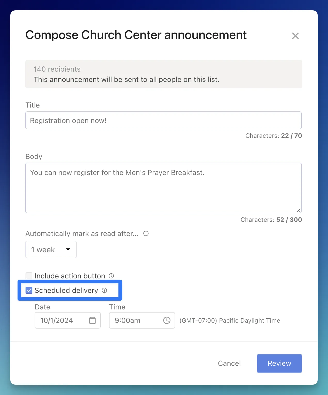 This spring, we released the ability to schedule emails in Planning Center People, allowing you to plan your communication ahead of time. Today, we’re continuing that theme with the release of scheduled Church Center announcements! 🎉