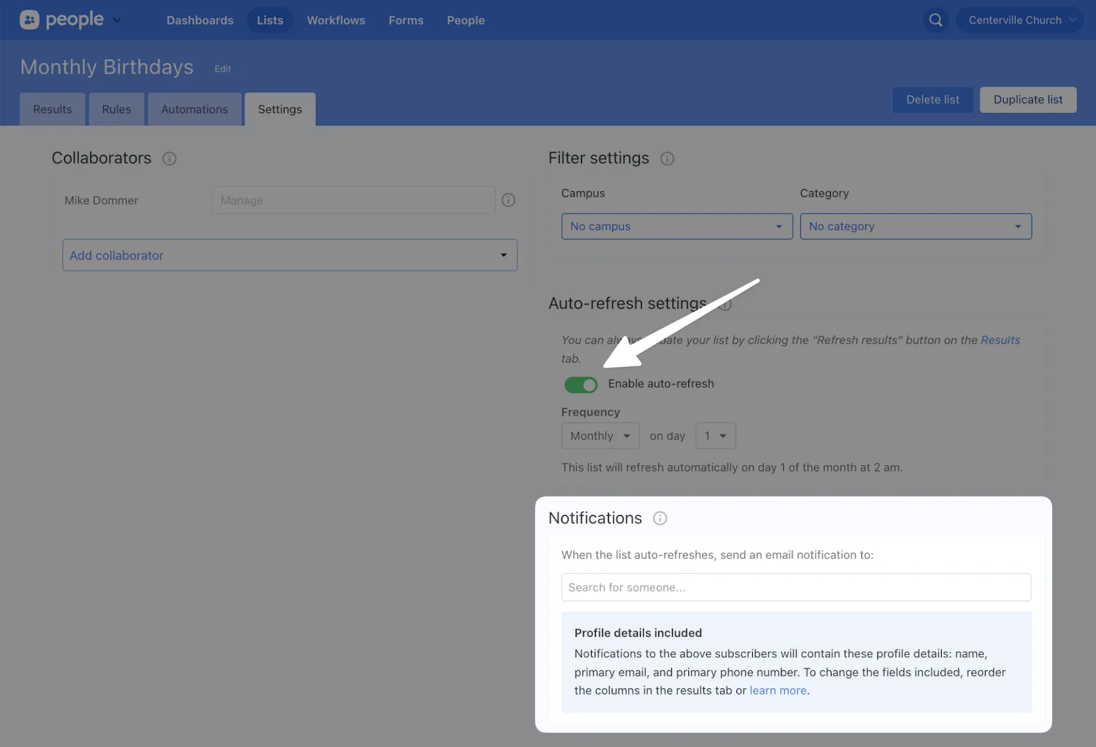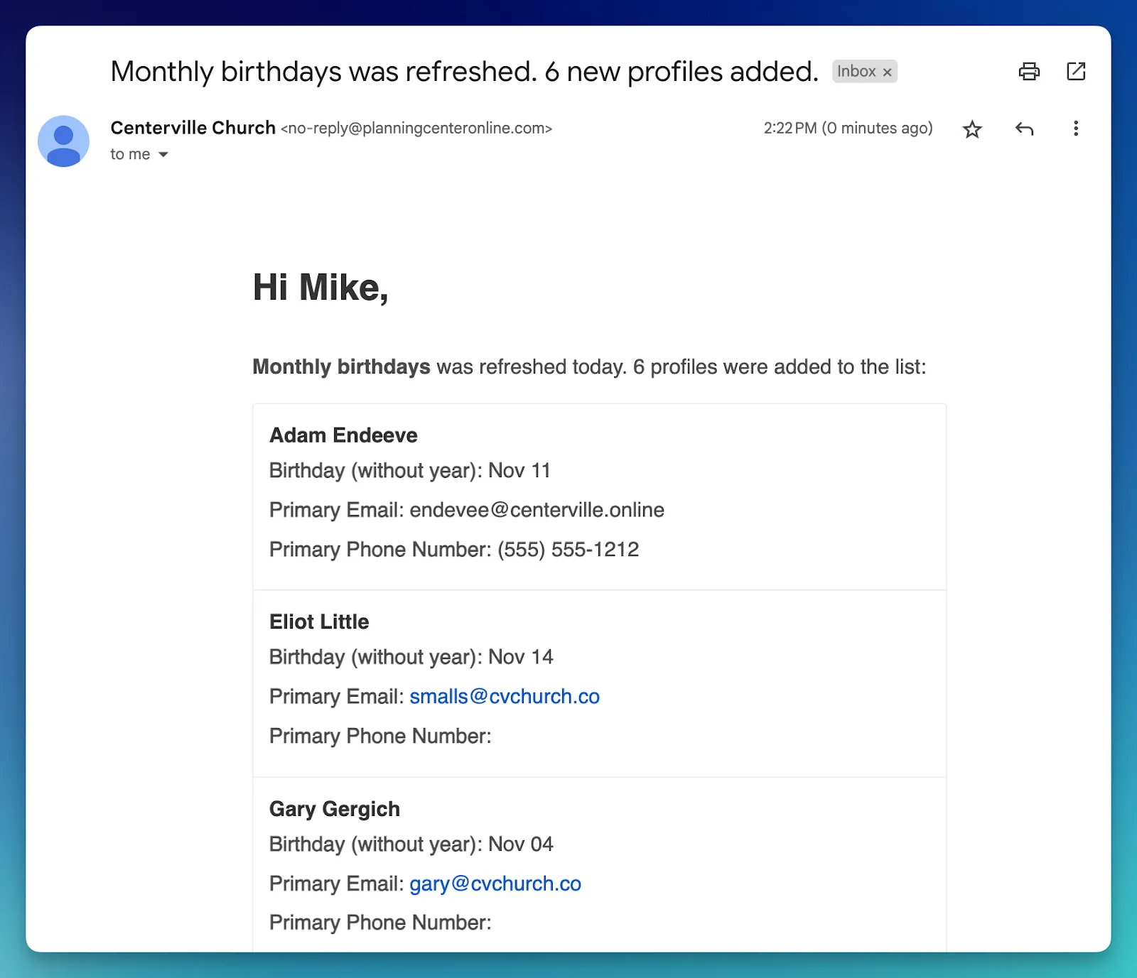 You can search for and add any profile in your database, even if they don’t have permission in Planning Center People. Whenever this list refreshes, these people will receive an email notification showing anyone who was added to the list since the last refresh.