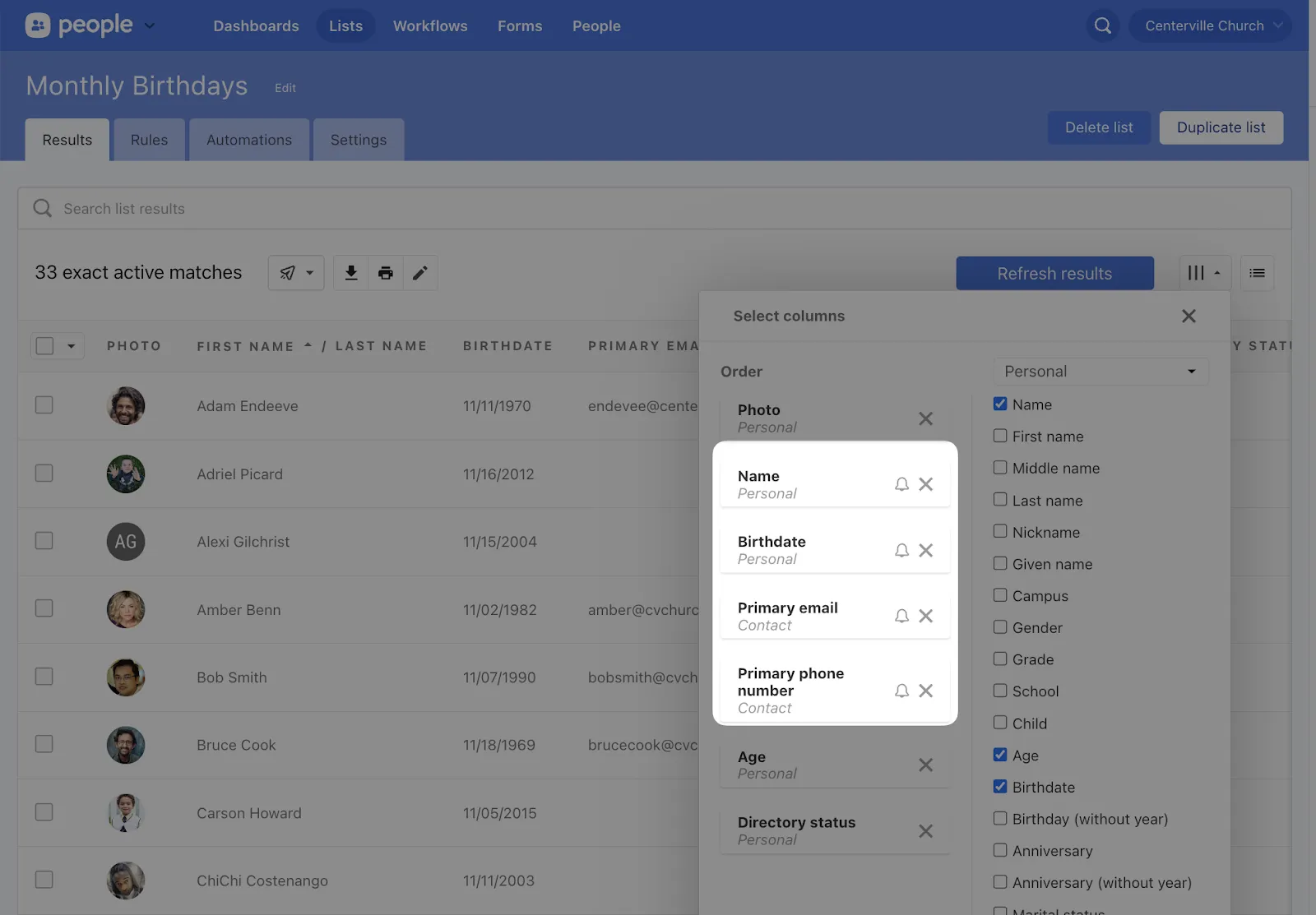 The full name of the profile will always be shown, followed by the next three columns of data in the list. This allows you to rearrange the columns to ensure the data you want to see is present in the email. For example, if you have a list of everyone with a birthday this month, you can rearrange the columns so that birthdate is visible in the first three columns and, therefore, included in the email.