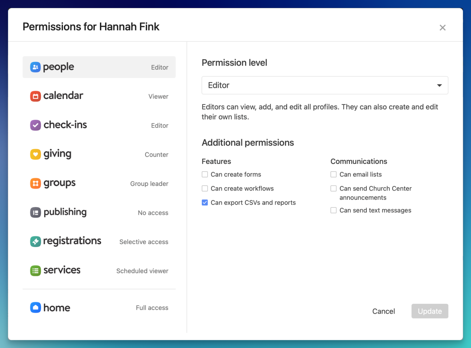 Previously, all users with any level of access to Planning Center People could export CSVs and reports. We’ve now separated this ability into its own permission setting for Viewers and Editors.