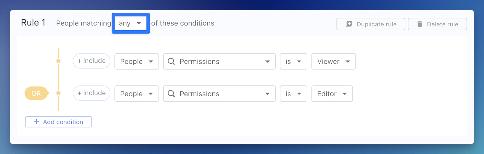 While this will be off by default, we have enabled it for all existing Viewers and Editors, so there is no loss of functionality. However, this is a good time to review your permission settings and clean up any that are no longer needed. If you would like to easily see all your Viewers or Editors, we have a List condition for that! Just use People > Permissions > is > Viewer (and/or Editor), or any combination that fits your needs.