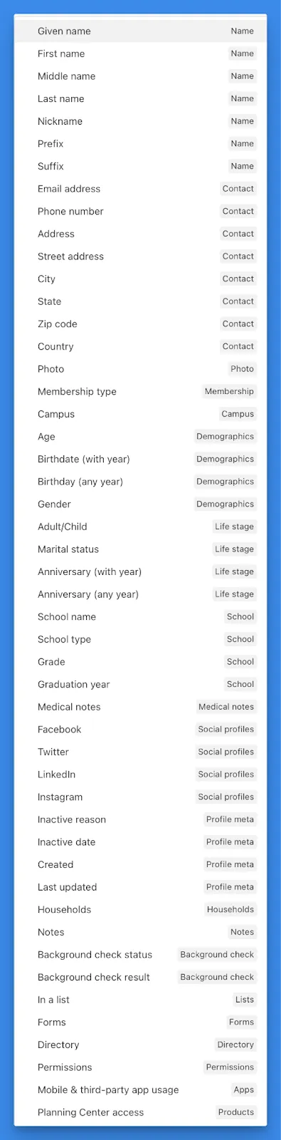 We’ve added labels and grouped similar conditions to help with discovery. We also renamed two conditions to better explain their purpose: ”Authorized Application” is now “Mobile & third-party app usage,” and “Applications” is now “Planning Center access.”