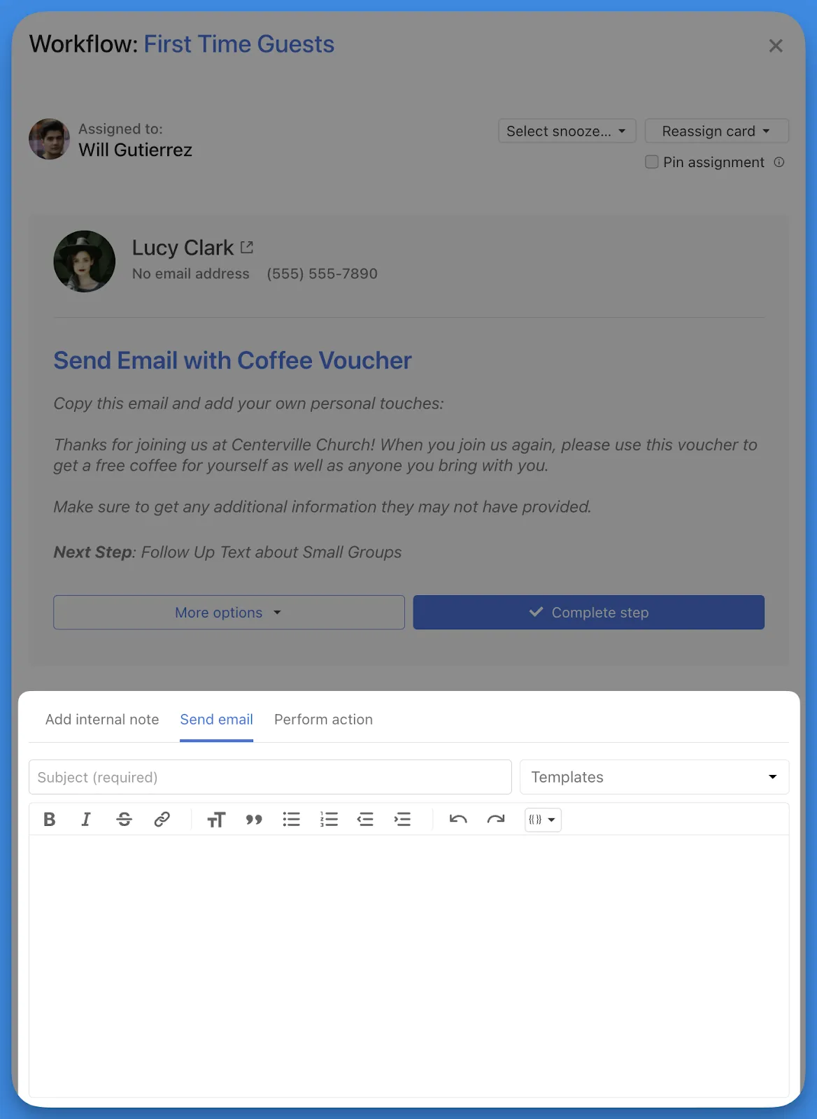 People's workflow card emails now have the same time-saving tools and features you’ve come to expect: rich text formatting and the option to use email templates.