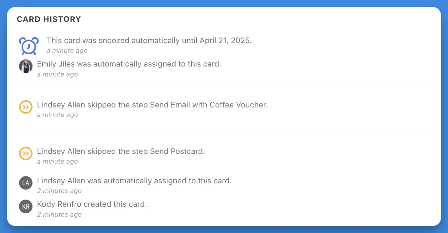 Like other card actions, the card history logs the skip: