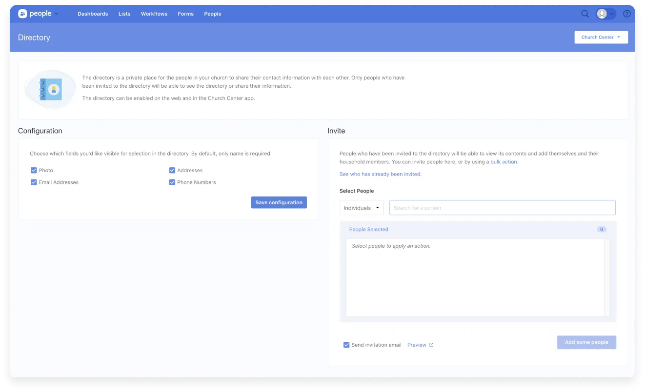 So before people’s information is included in the directory, you have to invite your congregation to join by sending an email through People.
