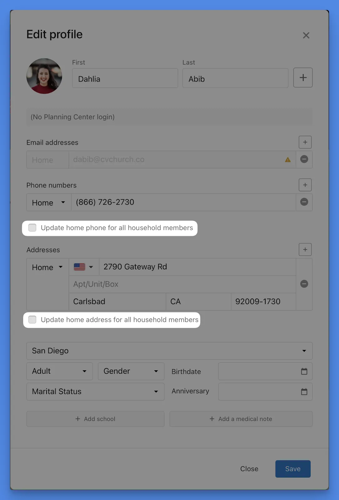 When editing a home phone or address for a profile, we dynamically show an "Update home X for all household members" checkbox. While convenient, we heard from many of you that this opt-out behavior sometimes caused accidental changes across households—especially when someone forgot to uncheck the box.