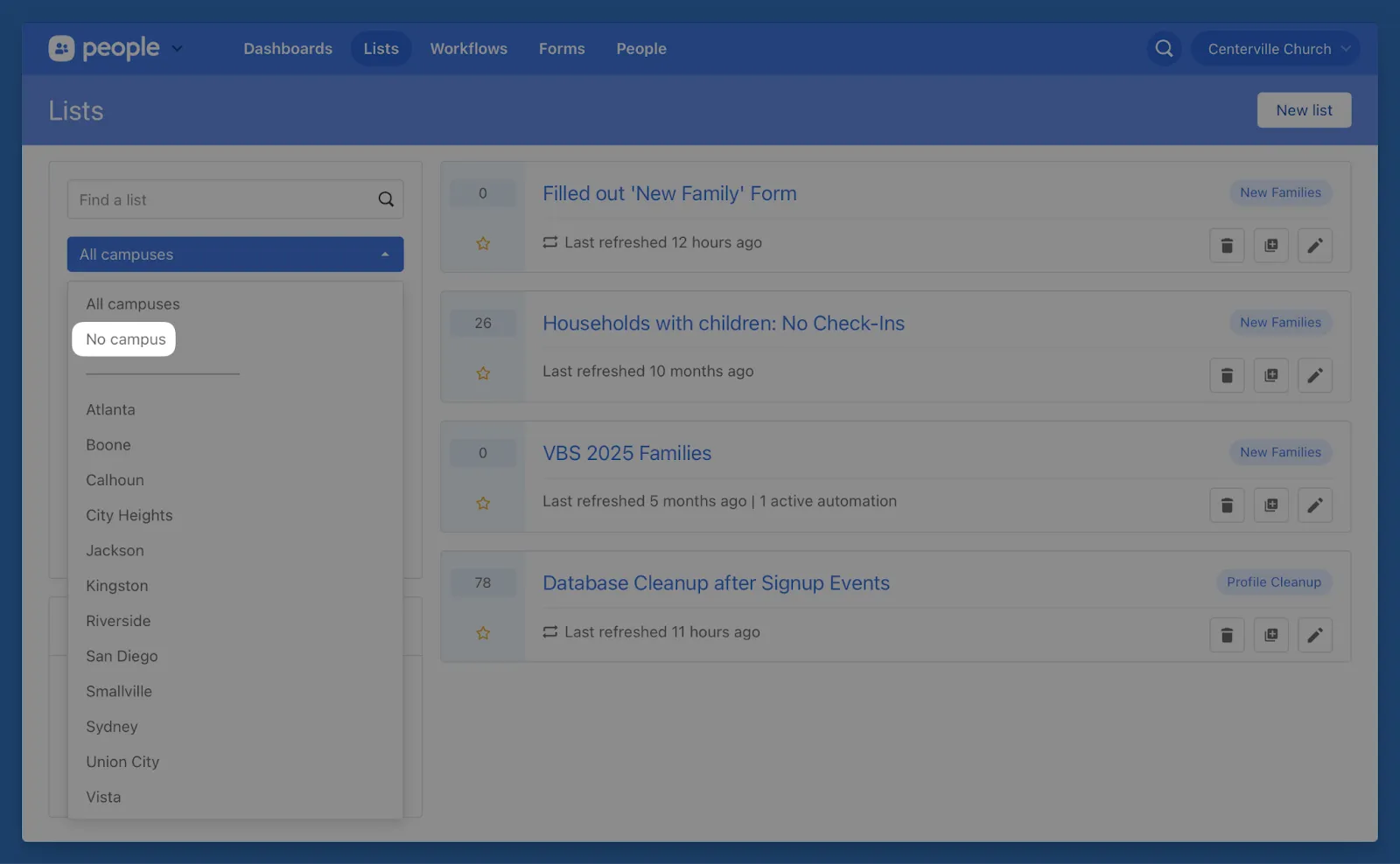 Last, we’ve introduced a “No campus” option on lists, workflows, and forms to easily identify resources that aren’t assigned to a campus yet.