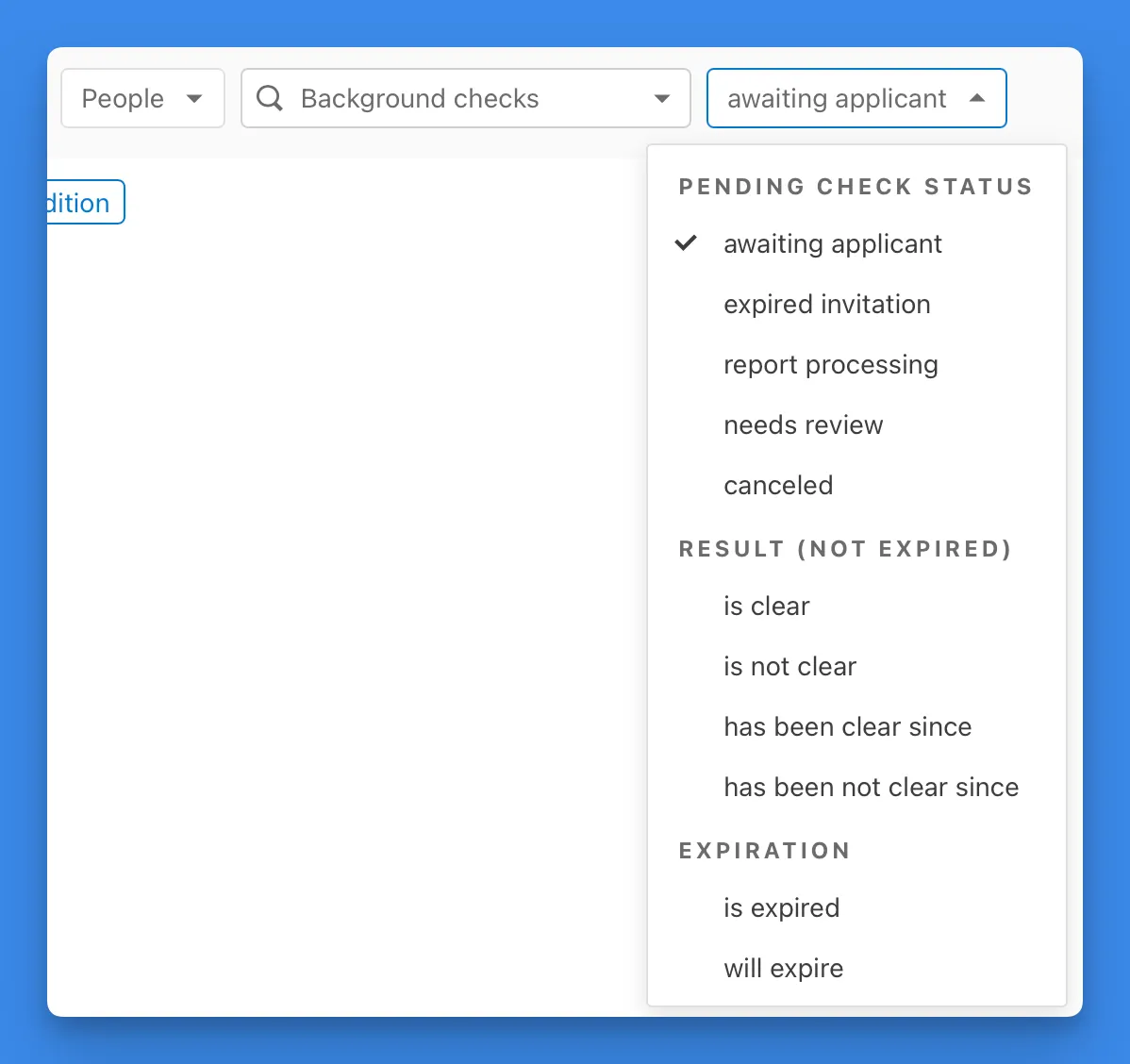 Previously, you had to choose between “Background check expiration” and “Background check status”, and it wasn’t clear which one would give you the list you needed. Now everything is one place, so you can find what you need without guessing.
