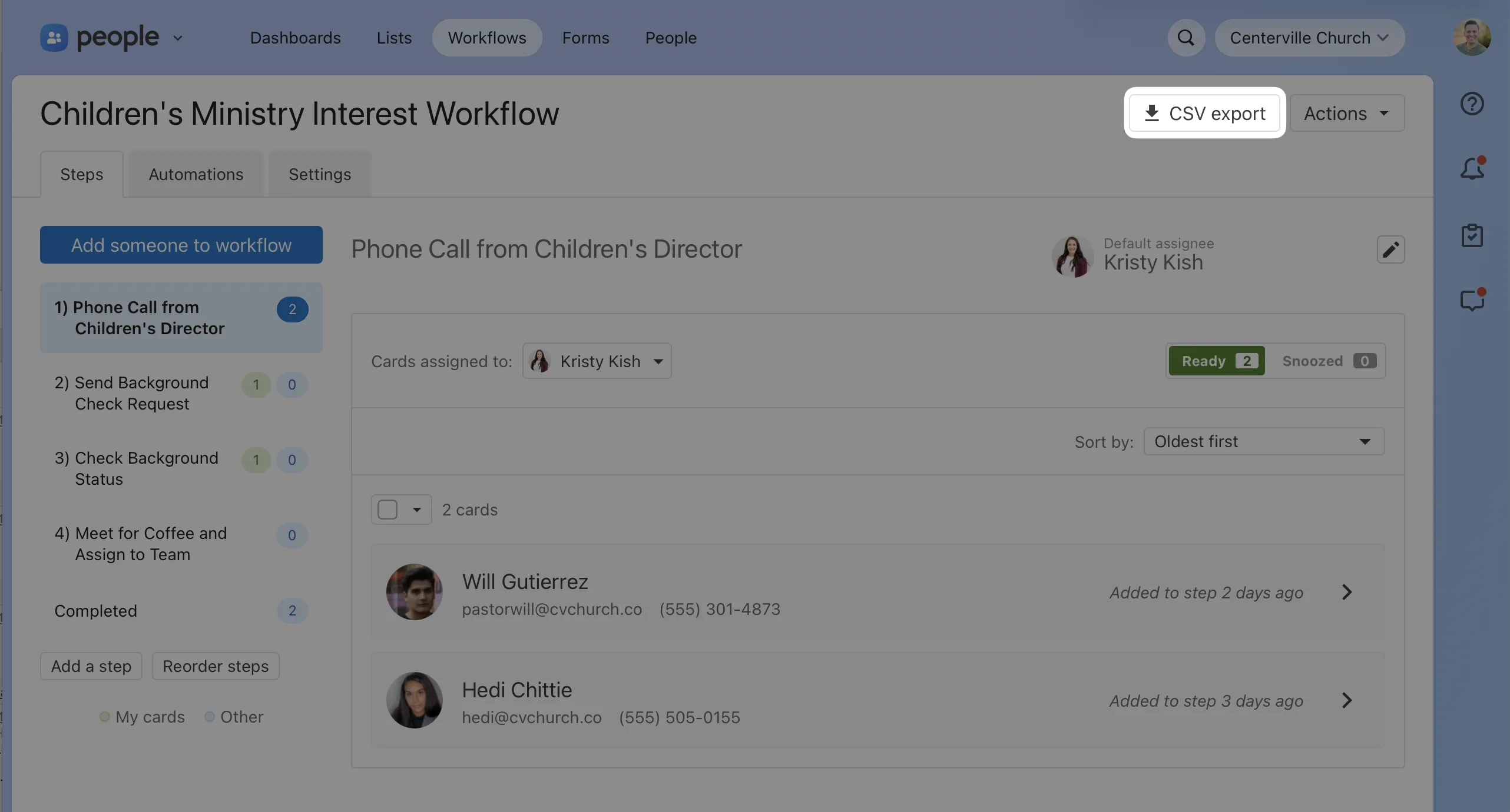 If you manage workflows, getting a snapshot of how all cards are progressing has meant opening each card individually or creating separate lists for each step and manually splicing the exports together. That works for small workflows, but when you're overseeing a connect process with hundreds of cards or trying to hold your team accountable on follow-up across multiple steps, it doesn't scale.
